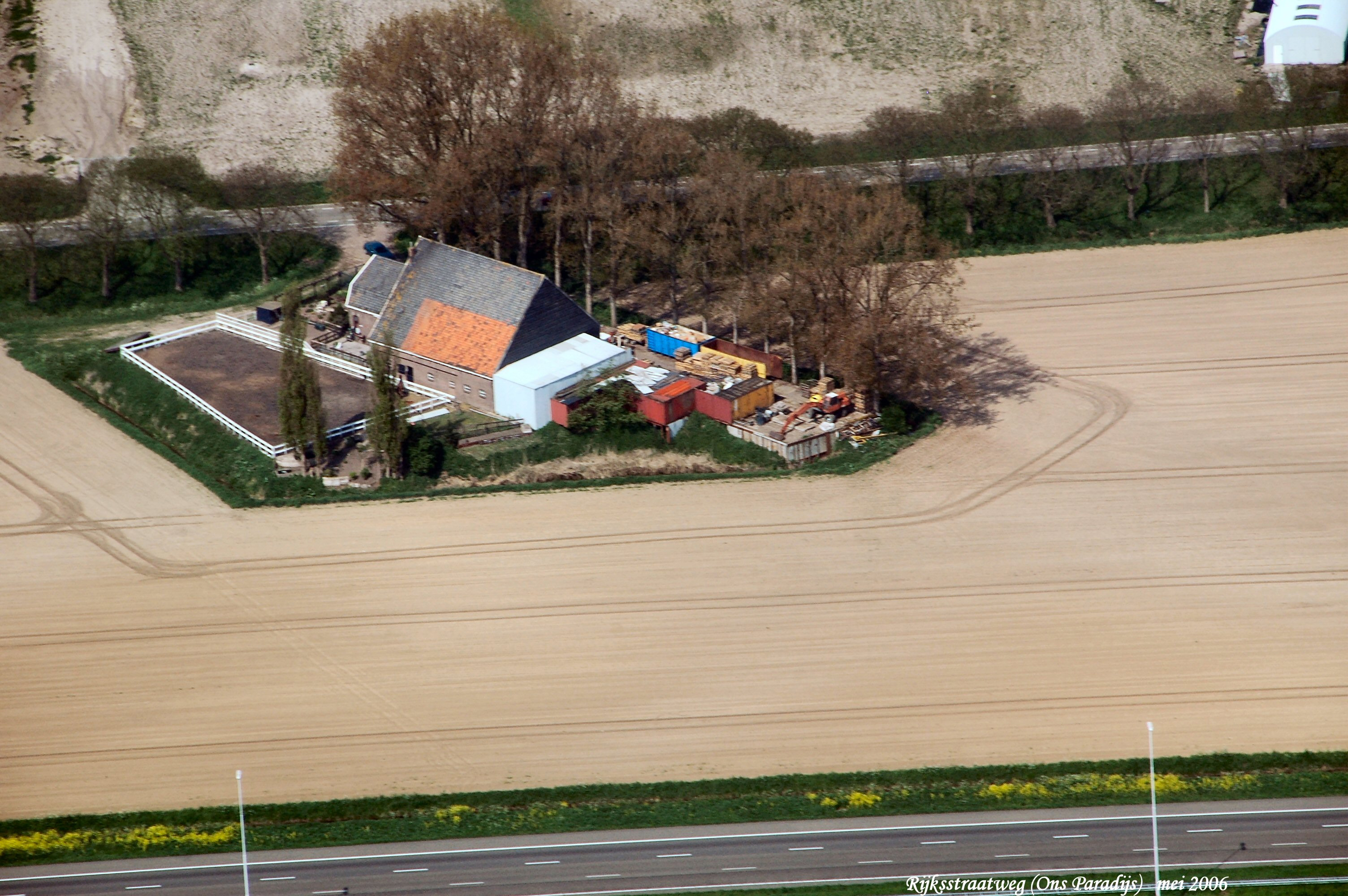 Rijksstraatweg met hoeve "Ons Paradijs" onder is de A16 gezien in Westelijke richting.