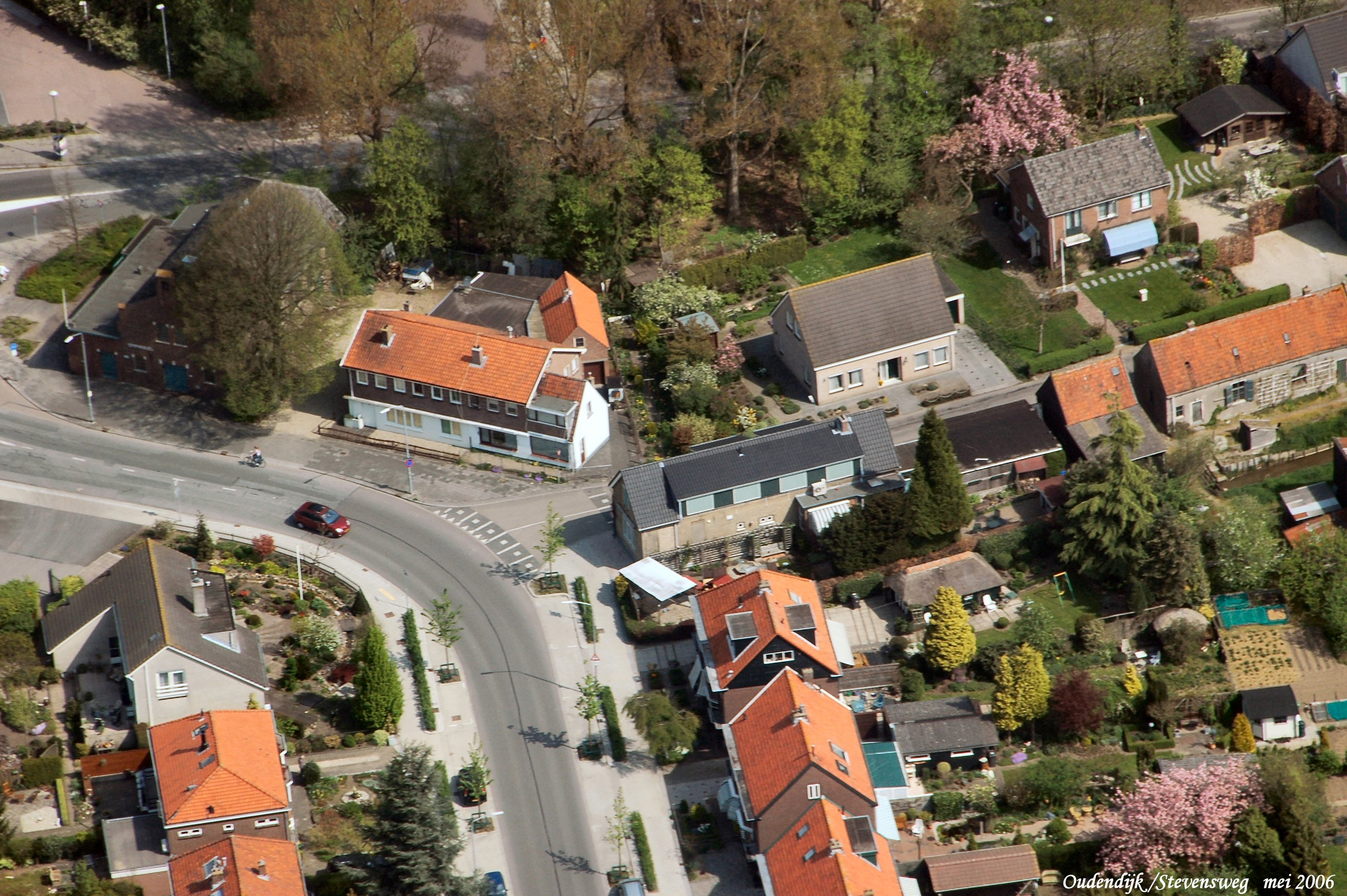 Mid.onder is de Stevensweg met rechts de Oudendijk. boven is de Eikenlaan. mid.links is "Helpt Elkander" nu Kerk van Christus. gezien in Noord/Westelijke richting.