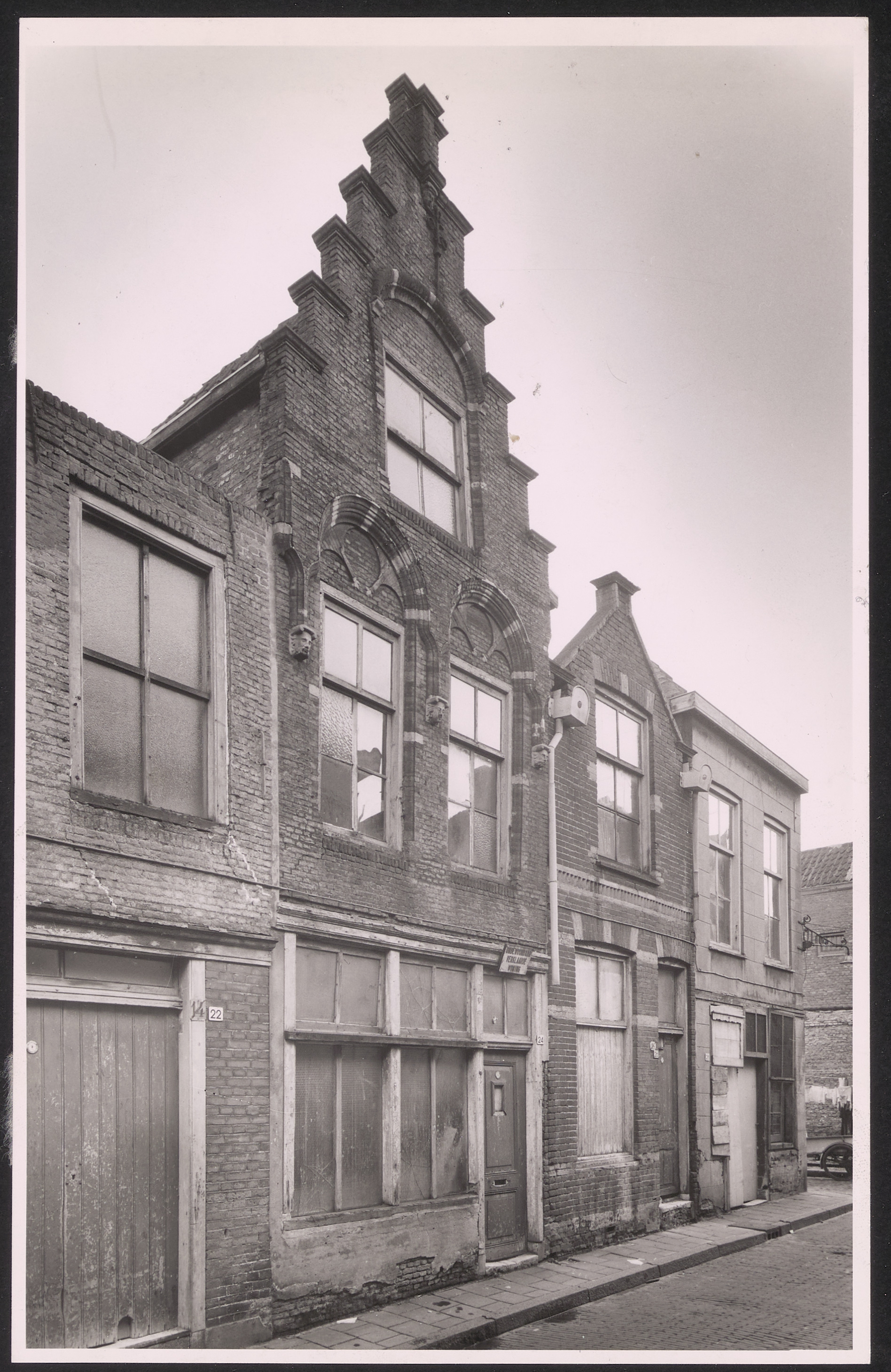 gevel Kolfstraat ? ----- 22 (oud 14), 24 (bordje: onbewoonbaar verklaarde woning), 26 (oud 16), 28