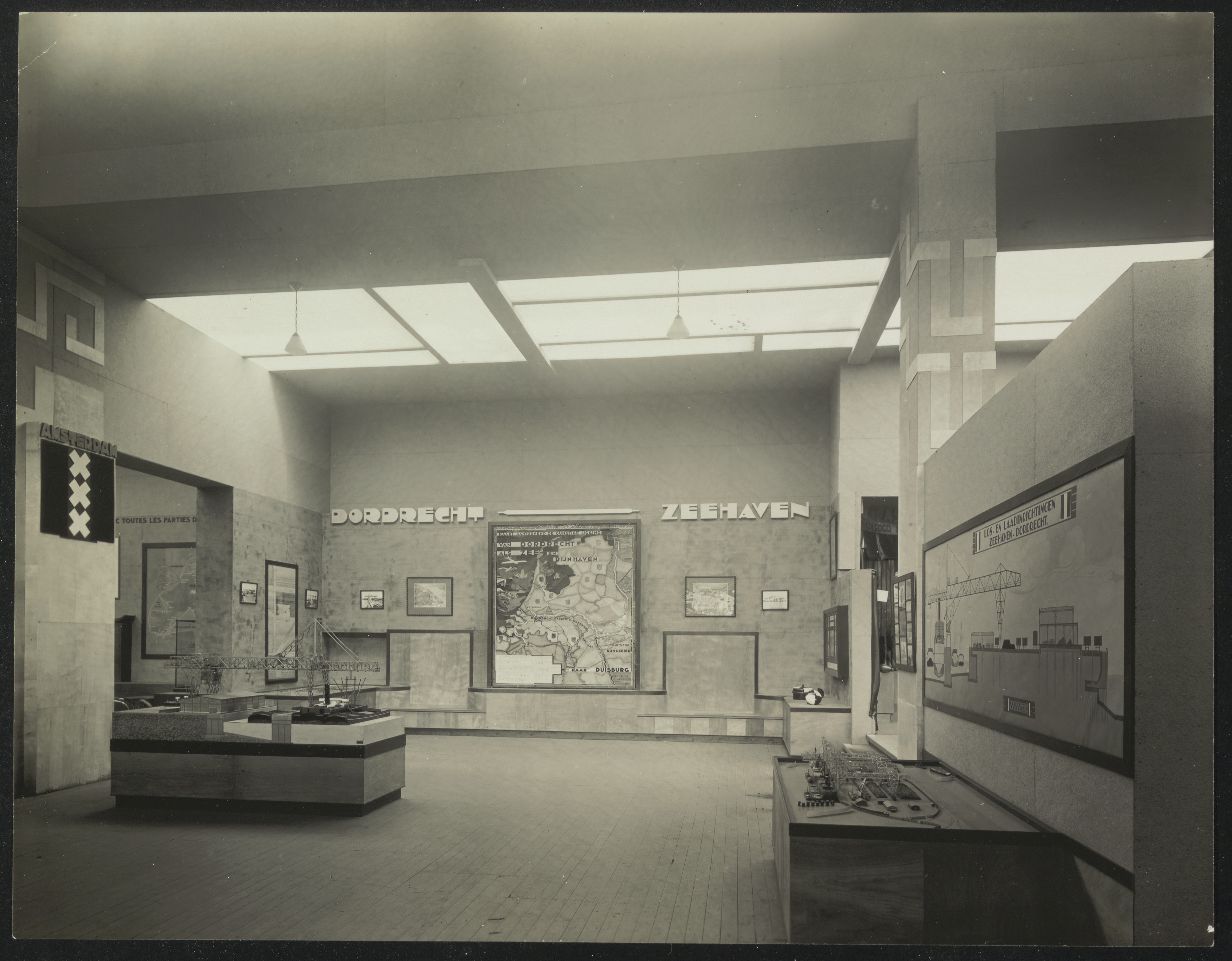 DORDT IN ANTWERPEN Jubileum-tentoonstelling Wereld-Bibliotheek. n Veertiental dagen terug vertelde onze speciale verslaggever een en ander over de Dordtsche inzending, die in het mooiste paviljoen der wereldtentoonstelling te Antwerpen moet aantoonen, dat onze stad gunstig is gelegen voor: de Binnenvaart, de Rijnvaart, de Zeevaart en de Industrie. Hij beschreef uitvoerig, dat dit schoone doel nagestreefd wordt door de maquette van de Zeehaven, een model der vier laadbruggen, een maquette van de stad en waterweg naar zee en de door Jaap Kastelein ontworpen lichtkaart en, kwam tot de conclusie, dat Dordt op een in ’t oog vallende suggestieve manier reclame voor zijn haven maakt. In zeker opzicht nu heeft hij schoon gelijk. Let wel, in zeker opzicht, want als de meer dan schitterende inzendingen van Amsterdam en Rotterdam er niet waren en dus Dordt niet overbluften, zou de collectieve Dordtsche inzending zeer zeker op de talrijke bezoekers, die nu al in architect Wijdevelds schoone schepping ronddwalen en die in de toekomst het Nederlandsche paviljoen overmatig zullen bevolken, indruk maken. ..... [De Dordrechtsche Courant, 1930-05-22; p. 1]