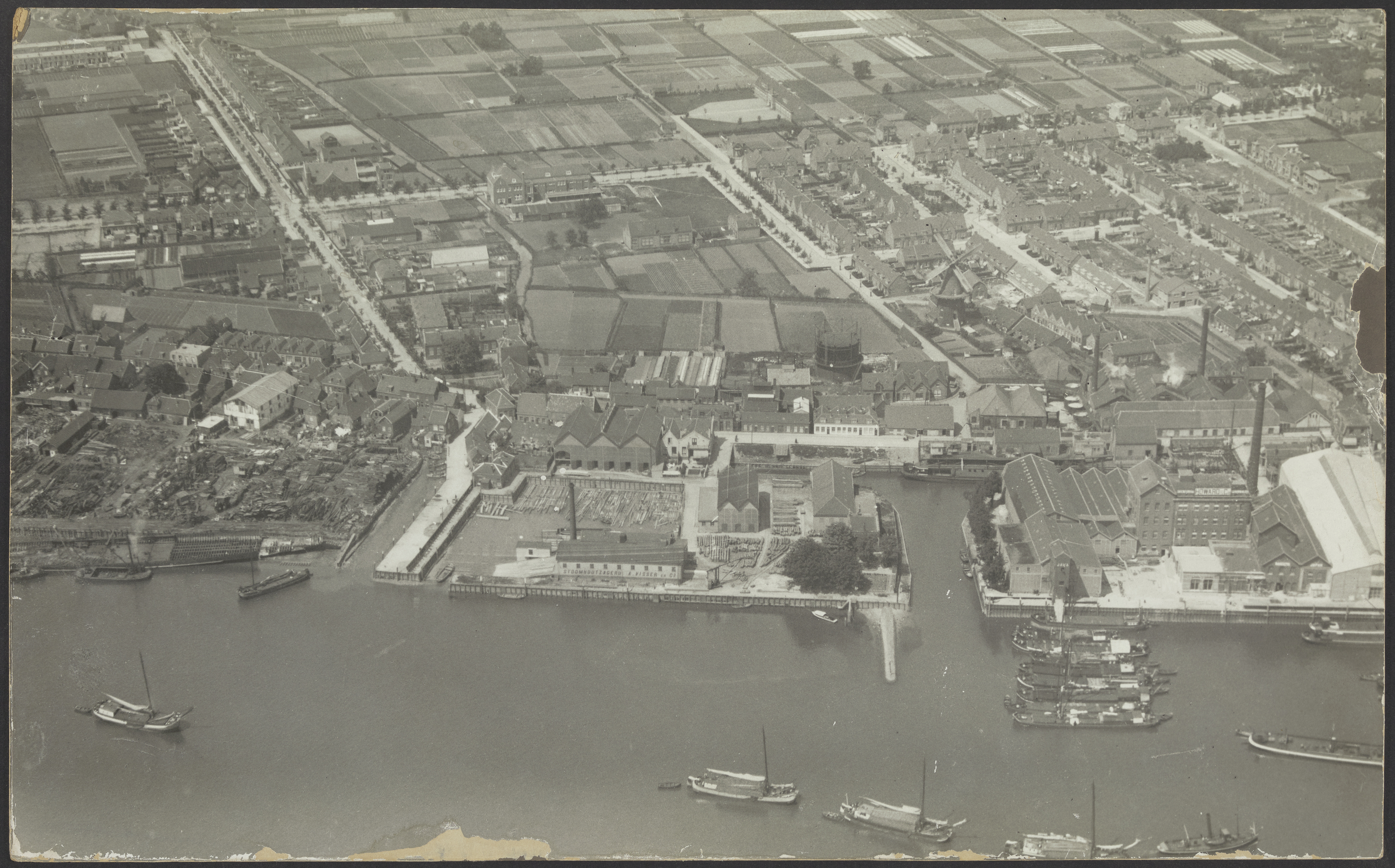 Luchtfoto industrie aan de Ringdijk met de Westkeetshaven. Erachter de gashouder van de gasfabriek en molen Landzicht. Op aviodrome.info wordt van deze luchtfoto, identificatienummer 004202ZR, als opnamejaar 1926 gegeven. Aviodrome beheert het archief van vervaardiger KLM Aerocarto.