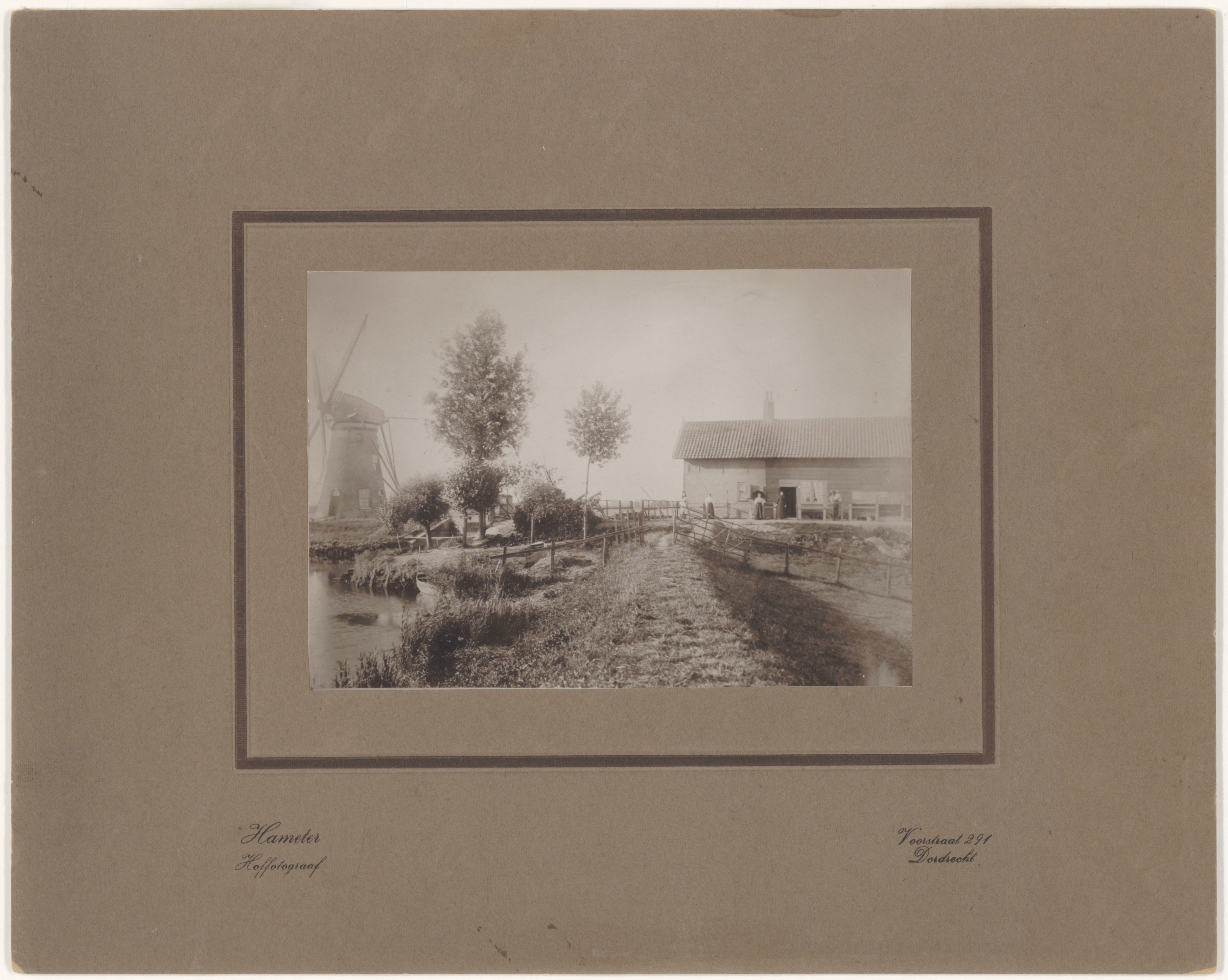 - Stellingloze molen, verlaat of sluisje, dijkje en laag huisje met mensen ervoor, gelegen in de Oost-Merwedepolder.