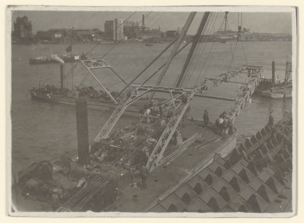 Bouw van een drijvende bok voor de werf van Penn & Bauduin aan de 's-Gravendeelsedijk. Op de achtergrond de Zwijndrechtse oever.