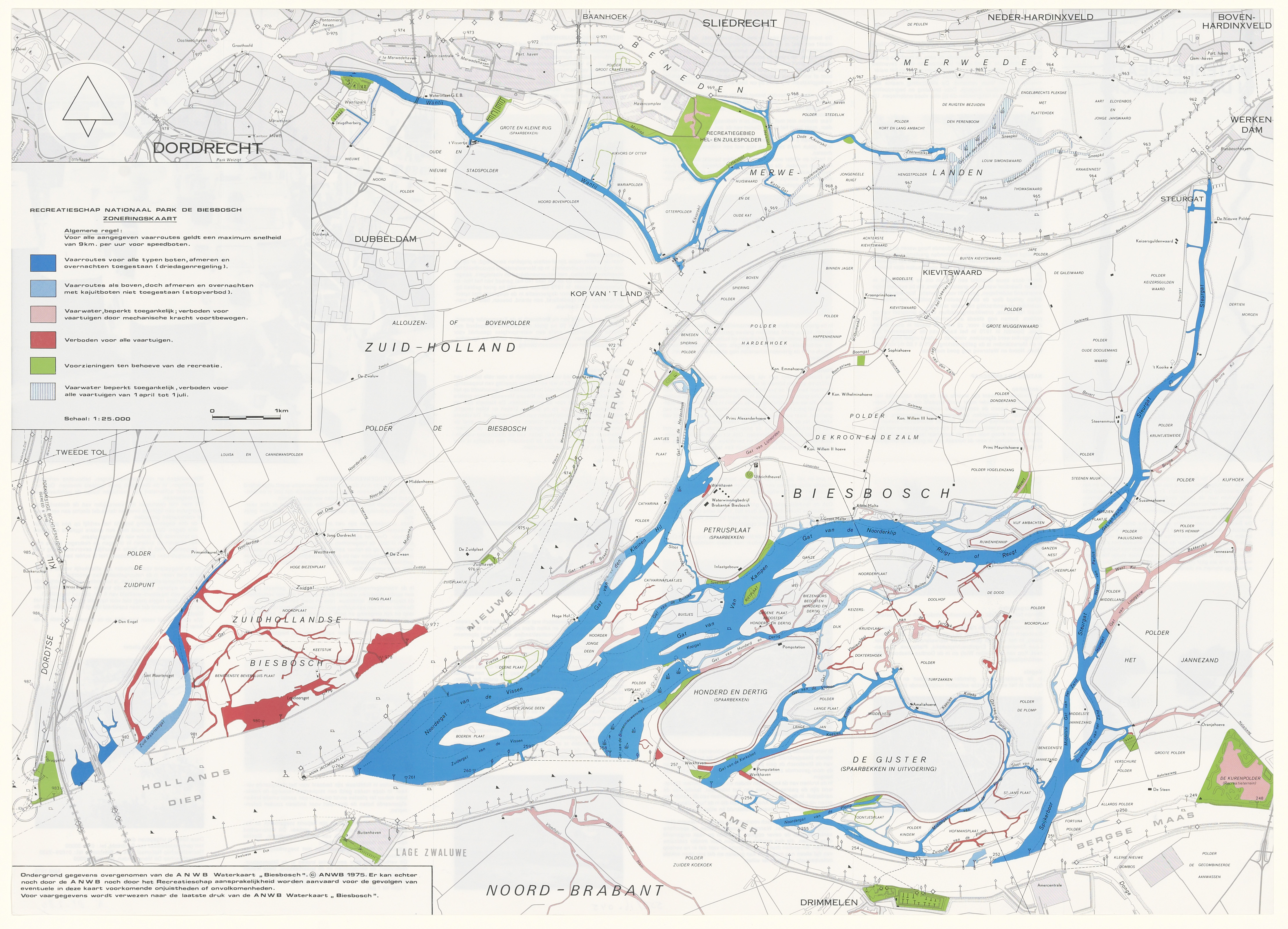 - Kaart van de Hollandse, Sliedrechtse en Brabantse Biesbosch met vaarroutes en zonering. Gebaseerd op de waterkaart van de ANWB van 1975.