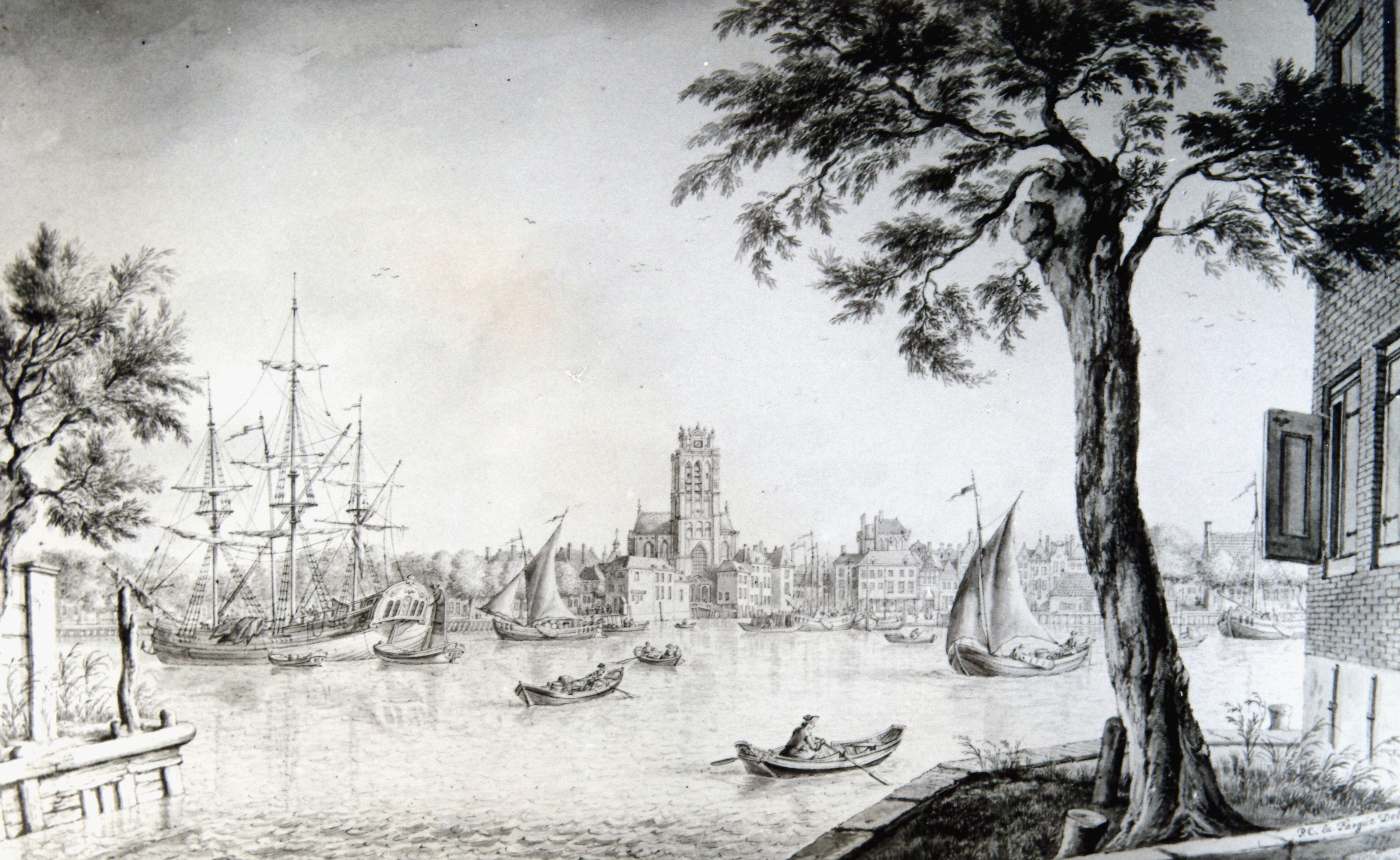 - Tekening in Oost-Indische inkt (27,5x47 cm) van P.C. la Fargue uit 1771. Gezicht op Hooikade, Bomkade en Buiten Kalkhaven vanuit Zwijndrecht over de Oude Maas.