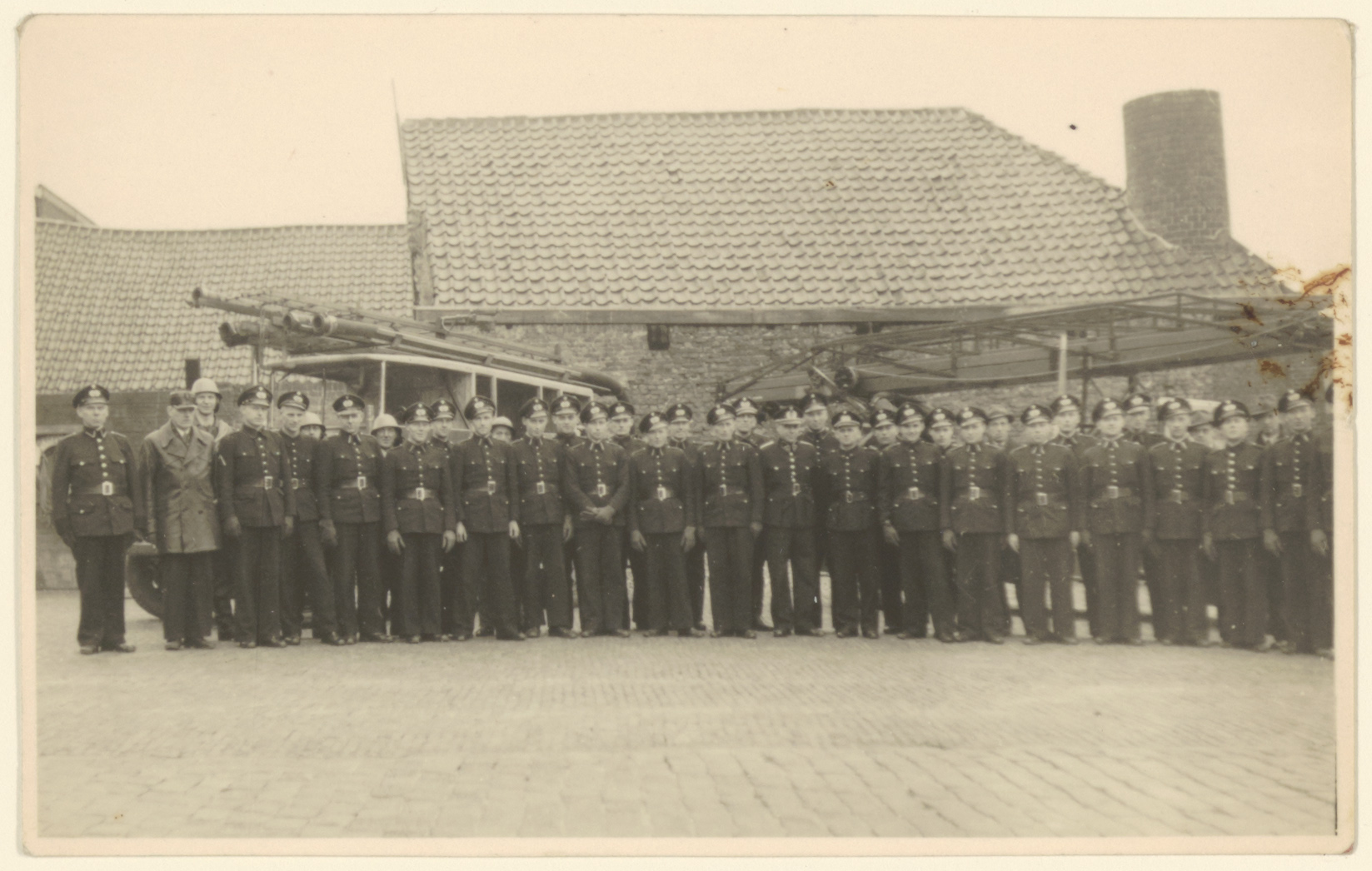 - Het voltallige korps beroepsbrandweer van Dordrecht op de binnenplaats van de kazerne aan de Vest. 4e van rechts voorste rij: J. Wegman, 8e van rechts: kapt. comm. Maas, uiterst links J. Lagendijk.