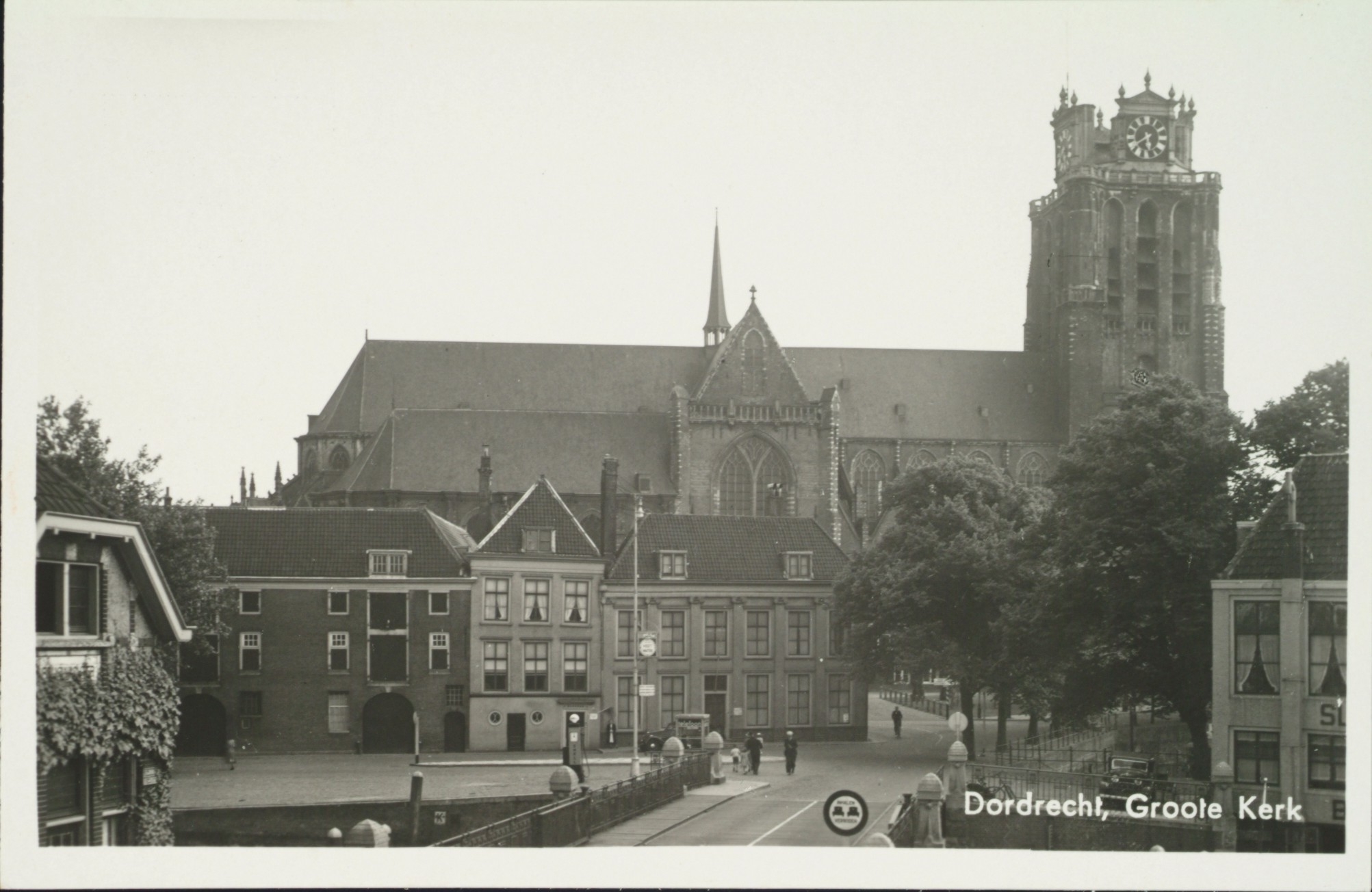 De Grote Kerk. Linksonder het brugwachtershuisje bij de Engelenburgerbrug, rechts daarvan het Rijksmagazijn aan de Houttuinen.