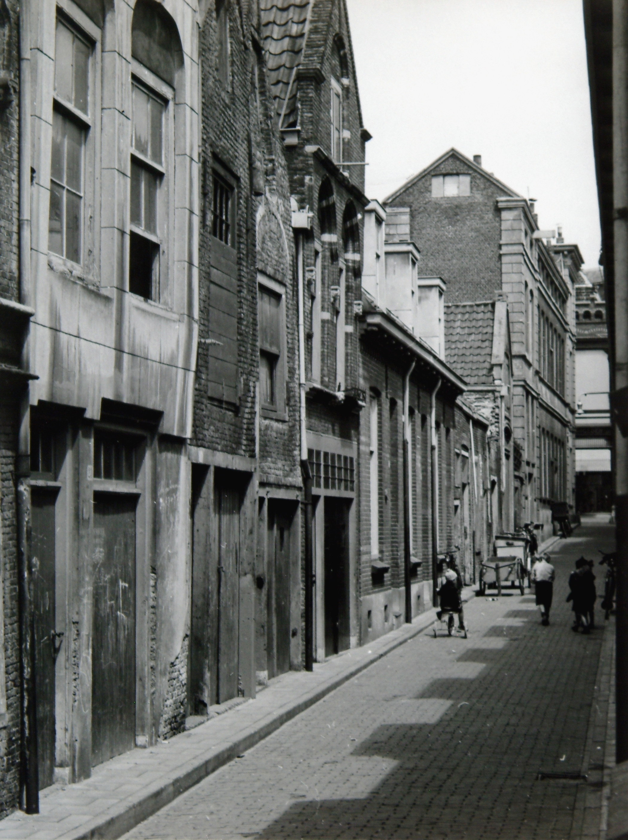 Vanuit de Boogjes kijkt men door de Pelserstraat naar de Voorstraat.