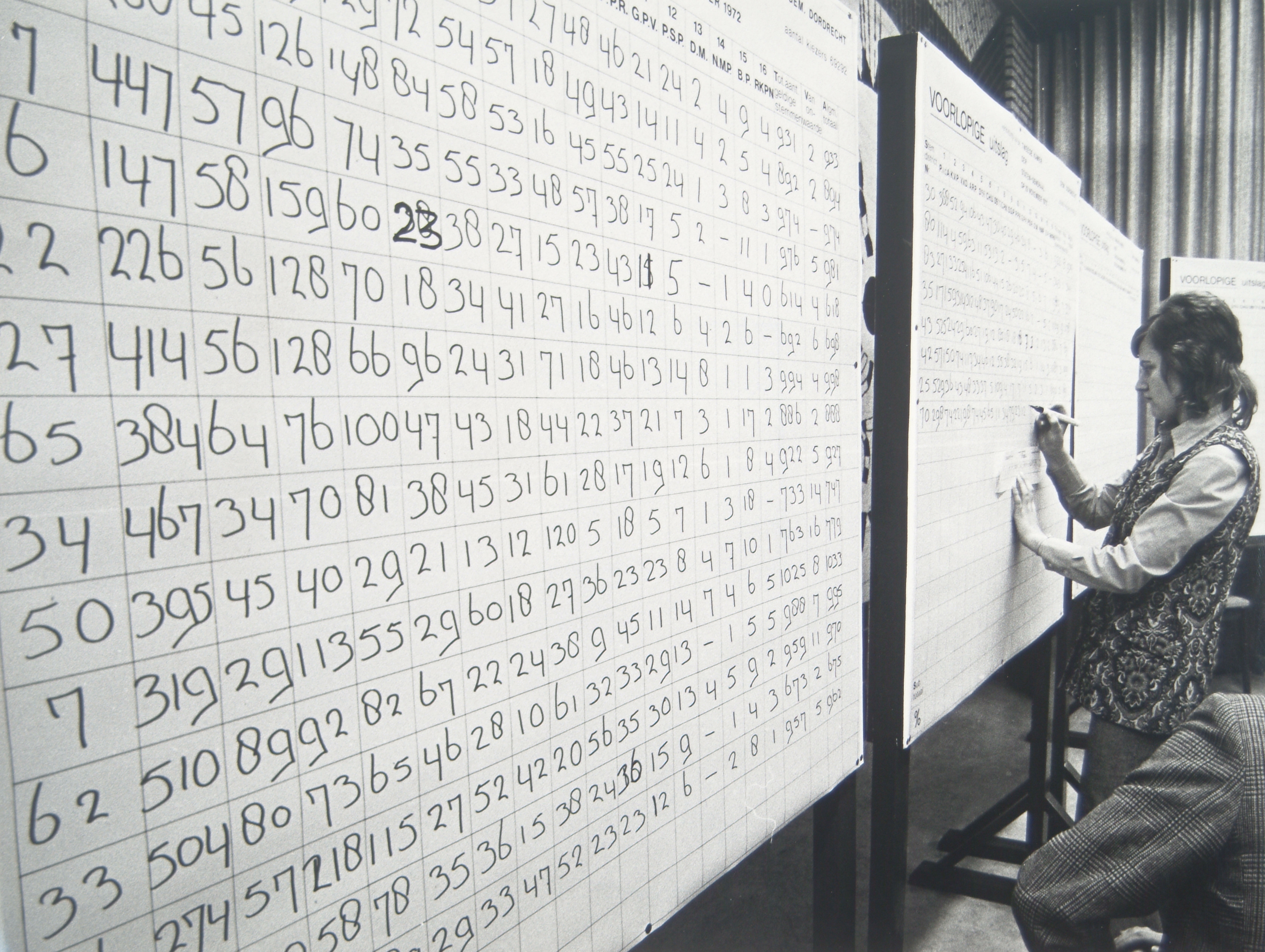 - Mevrouw noteert de voorlopige uitslag van de Tweede Kamerverkiezing in het kantoor van het GEB aan de Noordendijk