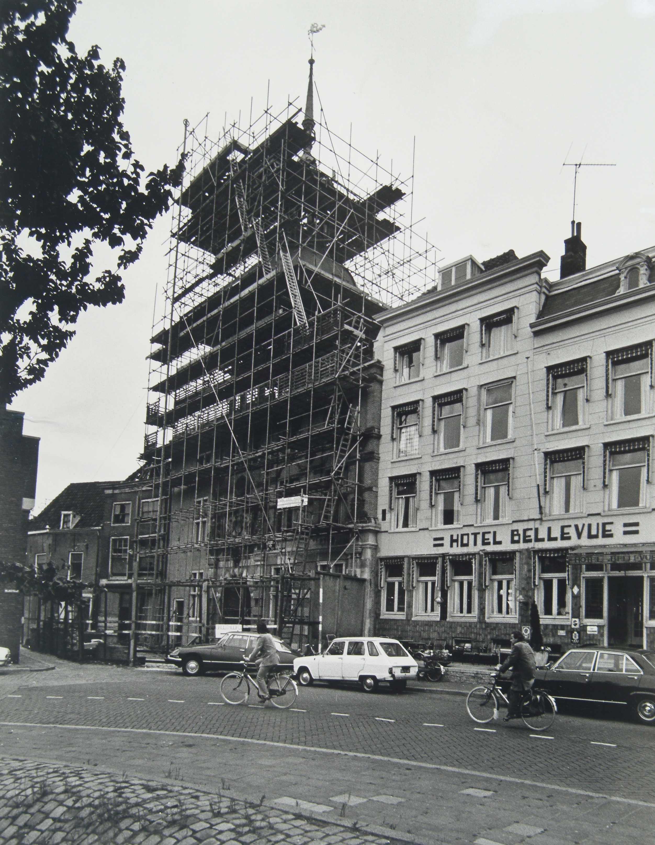 - Groothoofdspoort in de steigers vanwege restauratie. Rechts Hotel Bellevue in de Boomstraat.