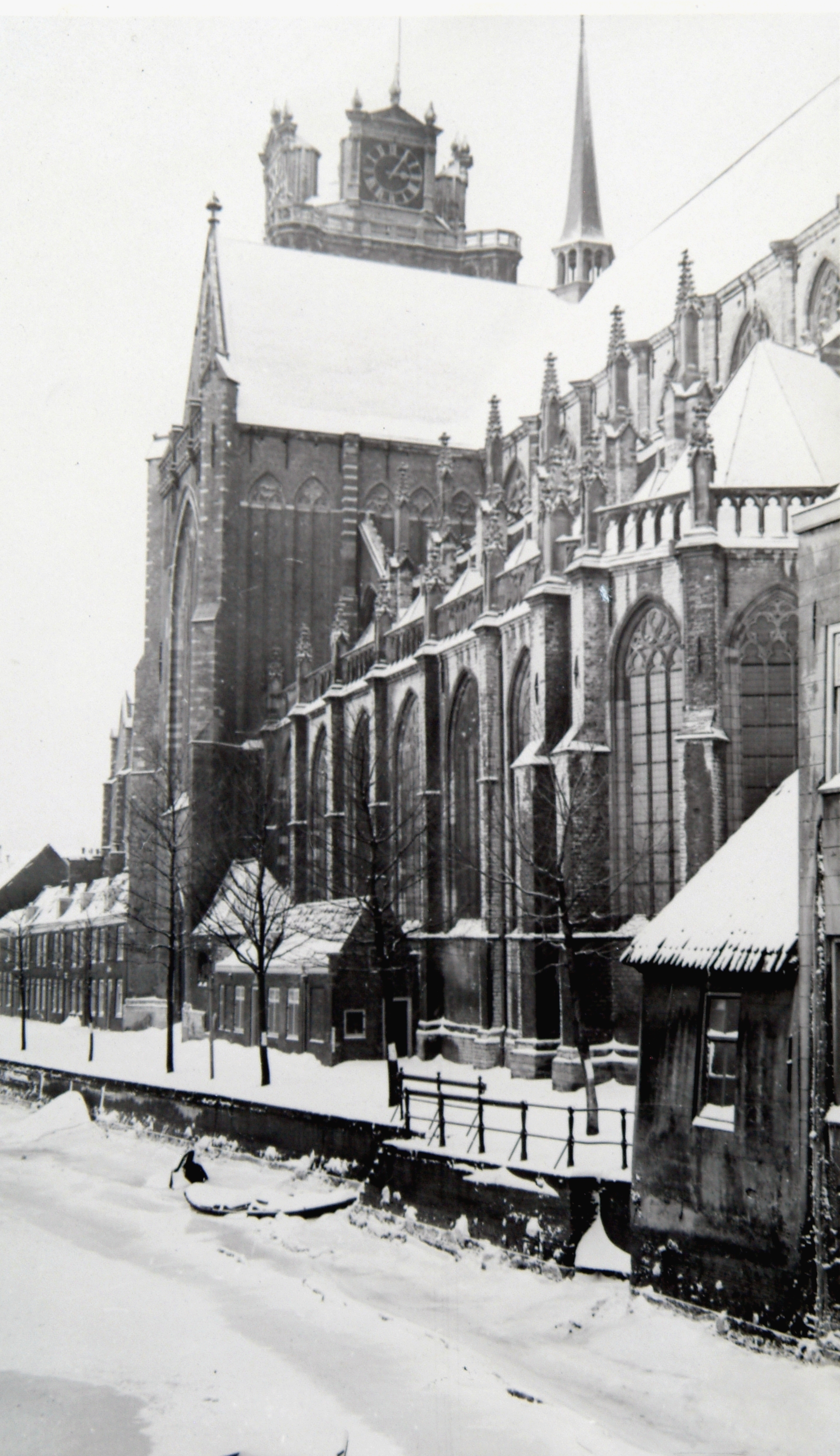 - Dichtgevroren Voorstraatshaven vanaf de Pelserbrug richting Pottenkade en Grote Kerk. In het midden staat het Korenmetershuisje.