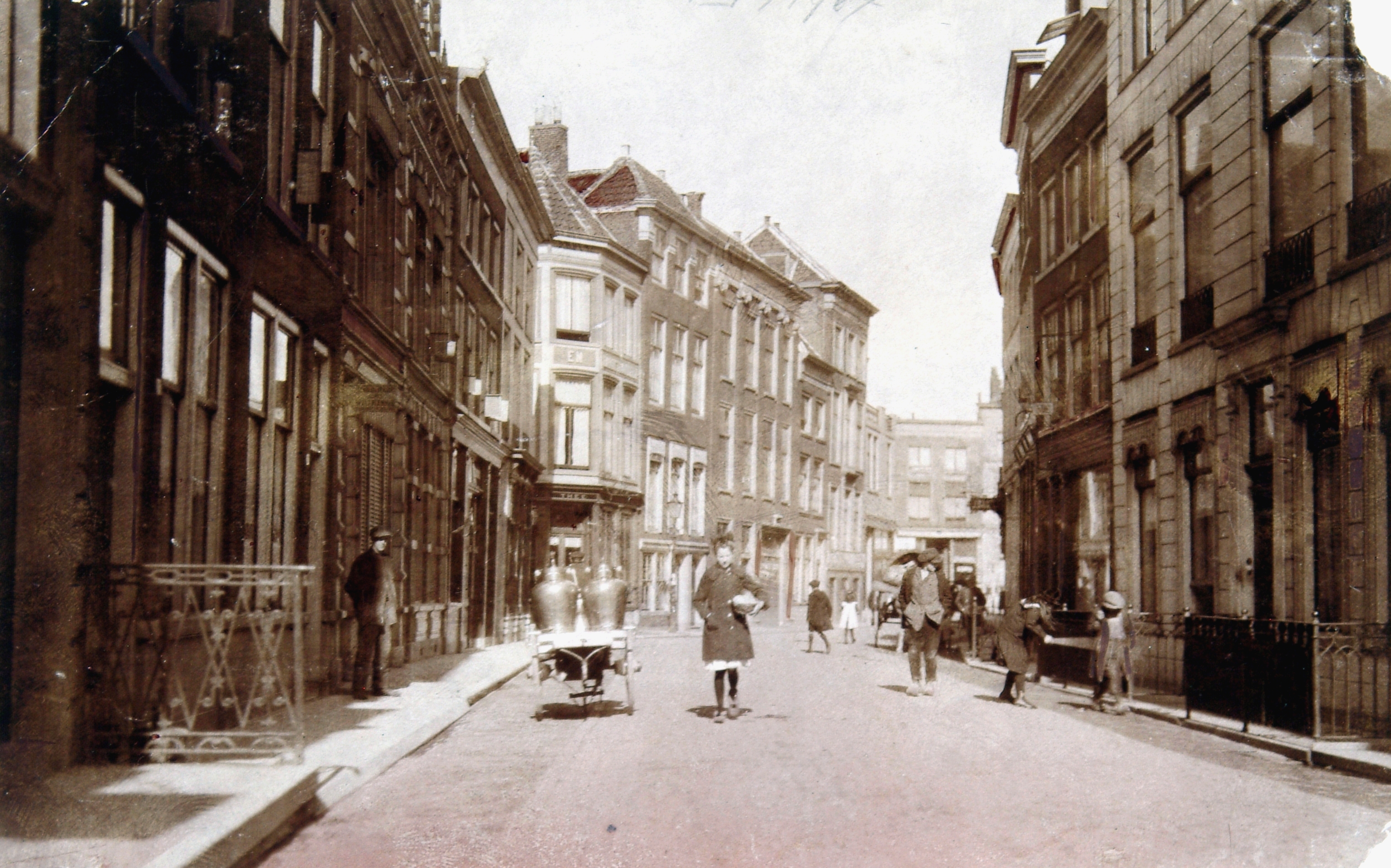 - De Prinsenstraat gezien vanaf de Sluisbrug, richting Voorstraat. De kar is van een melkboer. In het gebouw rechts op de voorgrond is het Diaconessenhuis gevestigd geweest.