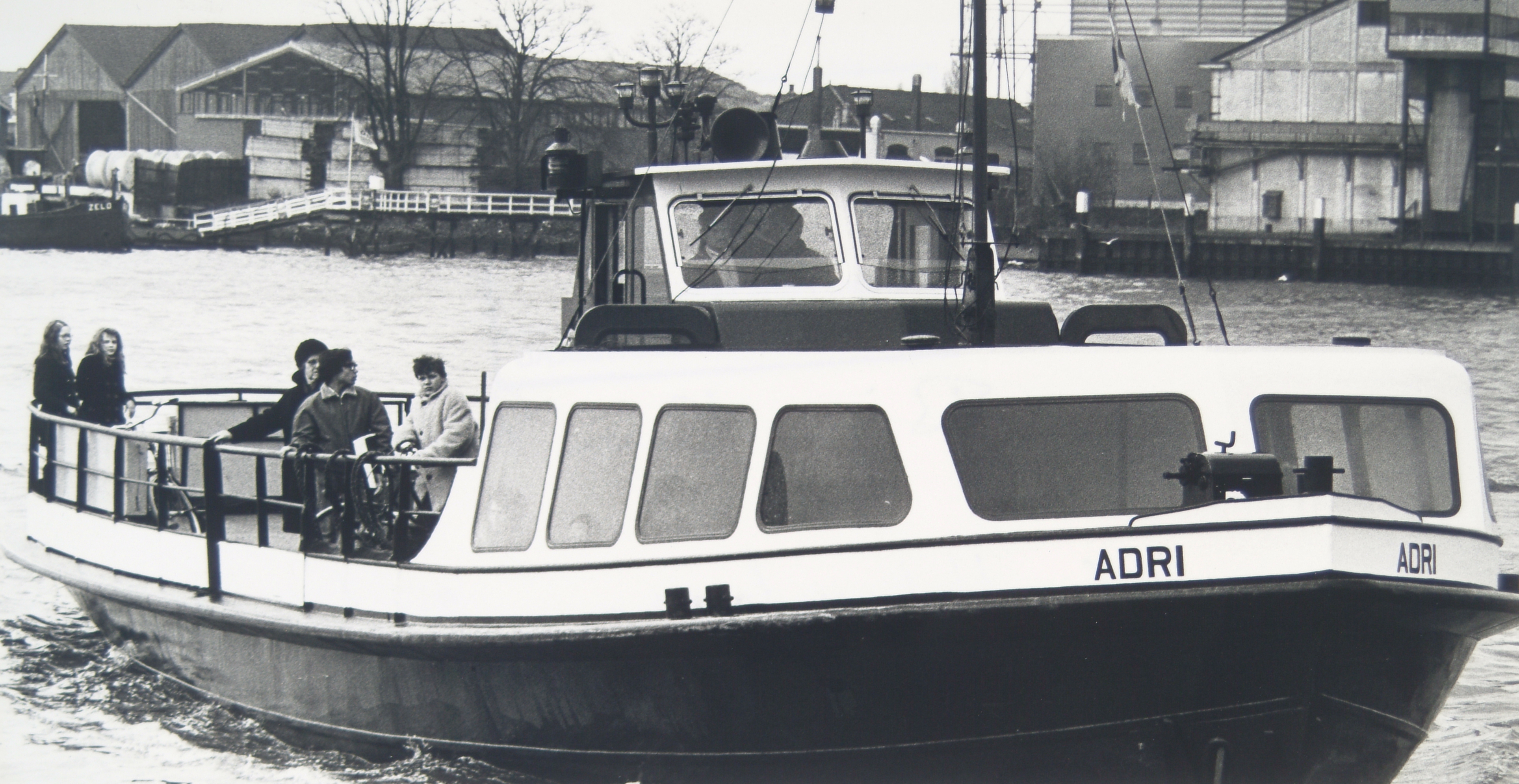 De foto is van voor 1972, want de Adri heeft hier nog geen radar. Die is er evenals bij al haar zusterschepen van de Fa. J. & A.M. Vos Veerdiensten opgezet na de aanvaring in de mist met de Neeltje Jorina op 6 december 1971 op de Noord (Kinderdijk-Slikkerveer), waarbij de schipper omkwam en de enige passagier gered kon worden. Bij het ongeluk met de Adri bij Zwijndrecht in 1980 kon de schipper wel gered worden. Overigens kwam de Adri pas in in 1983 weer in de vaart omdat er aanzienlijke schade gerepareerd moest worden, onder meer aan de motor die waterslag gemaakt had. In het casco zat slechts één gat in het achterschip veroorzaakt door het anker van de tanker en de schroefas was verbogen. In 1984 ging ze weer uit de vaart, niet vanwege publieksprotesten maar omdat de gemeente Dordrecht met eigen nieuw schip (de Drechtsteden 1) de veerdienst overnam. De Adri is verkocht aan het Amsterdamse veerbedrijf en na verbouwing van zij- naar koplader op het IJ in dienst gekomen als GVB 34. Anno 2019 is zij daar nog steeds in de vaart.