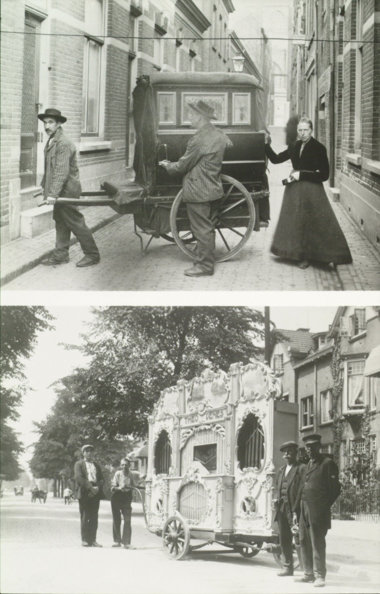 Boven: draaiorgel in de Dolhuisstraat, ca. 1910. Onder: draaiorgel Theo Denies op de …
