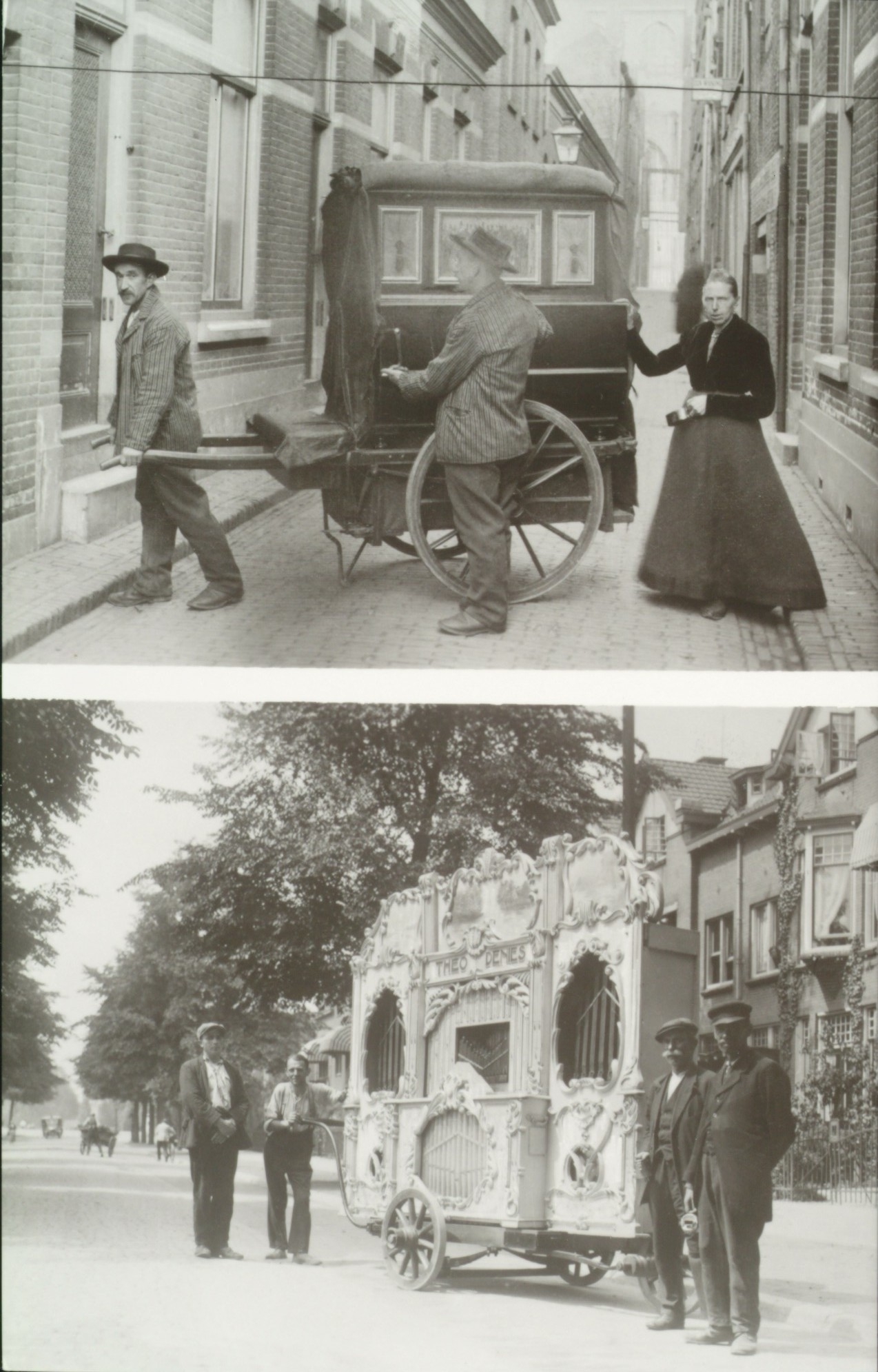 - Boven: draaiorgel in de Dolhuisstraat, ca. 1910. Onder: draaiorgel Theo Denies op de Reeweg Oost, ca. 1930.