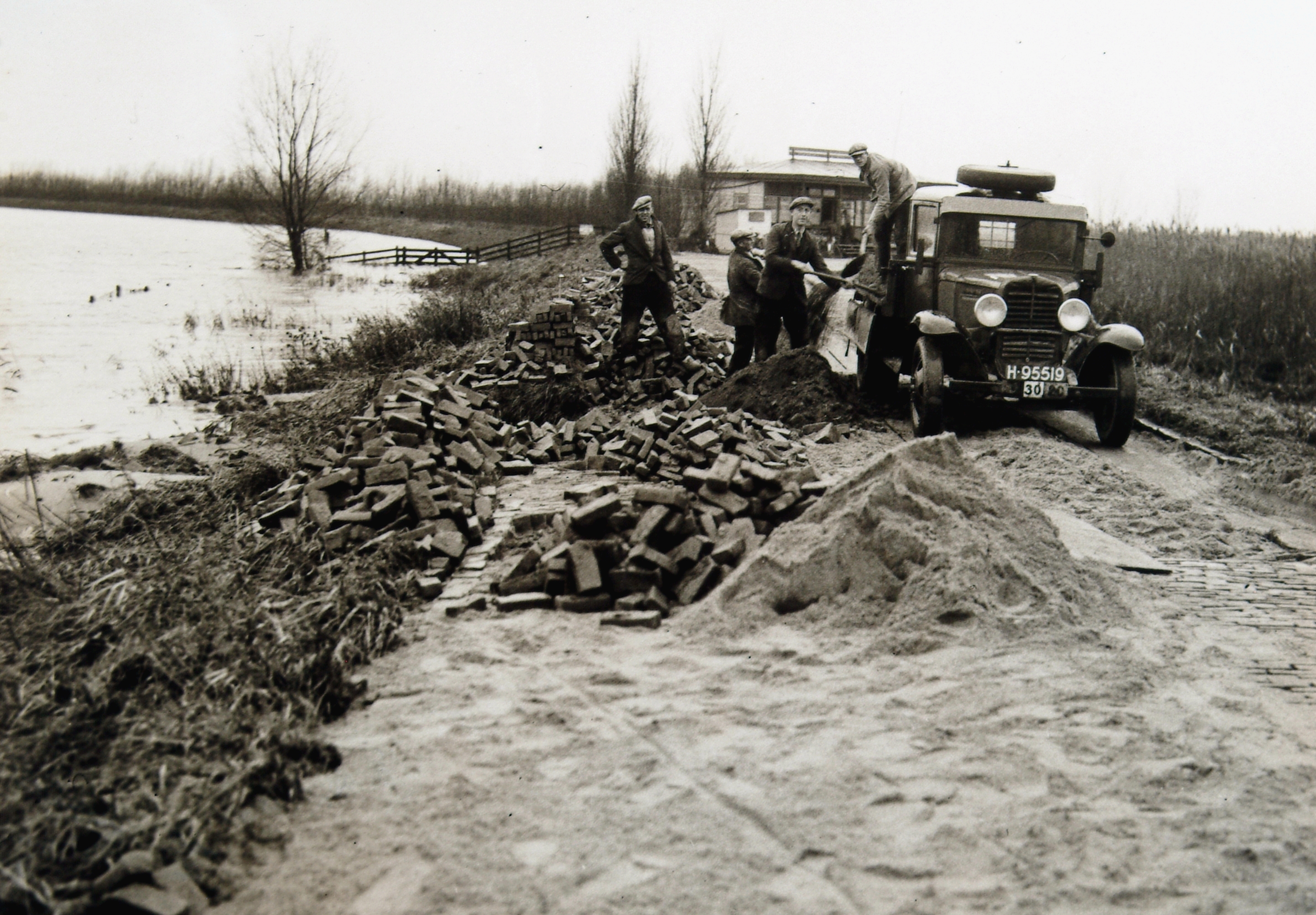 - arbeiders / werklieden dijkdoorbraken vrachtwagens