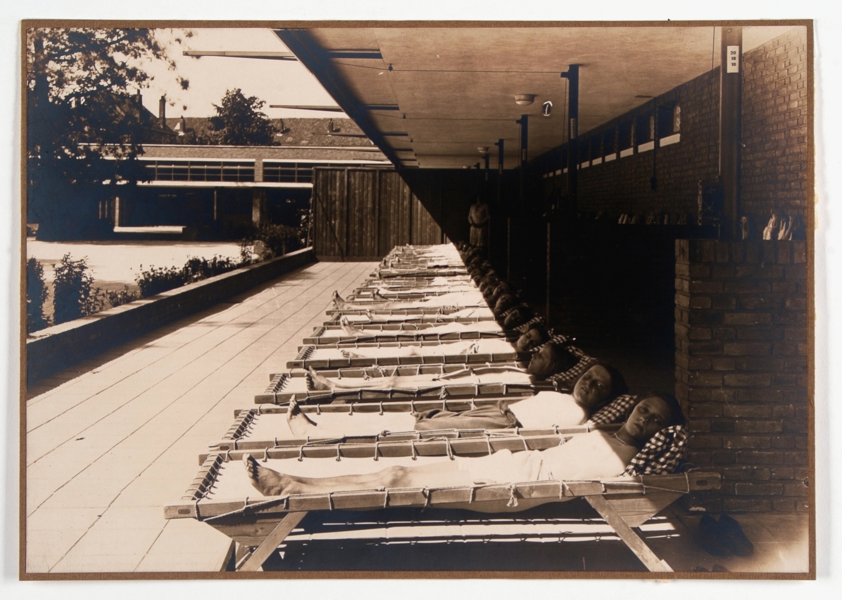 Kinderen rusten in de buitenlucht op de binnenplaats van de Buitenschool aan de Vrieseweg