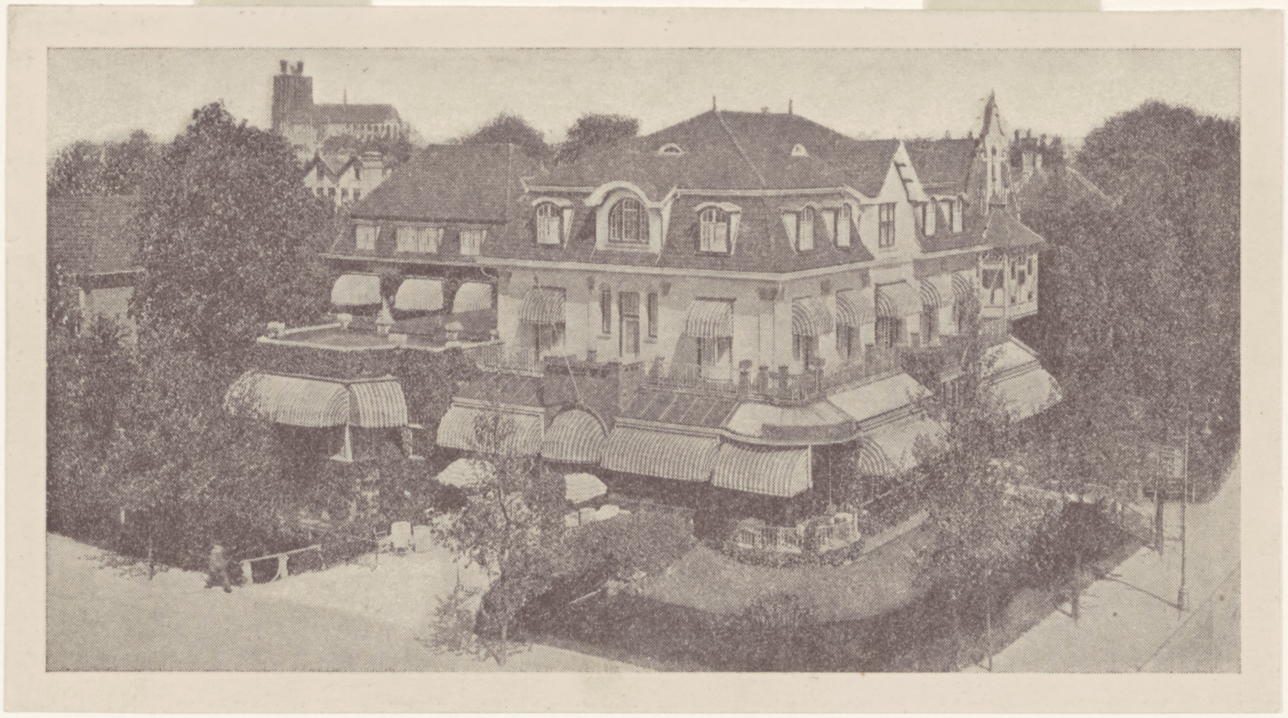 Hotel Ponsen op de hoek van de Stationsweg (rechts) en Burgemeester de Raadtsingel.