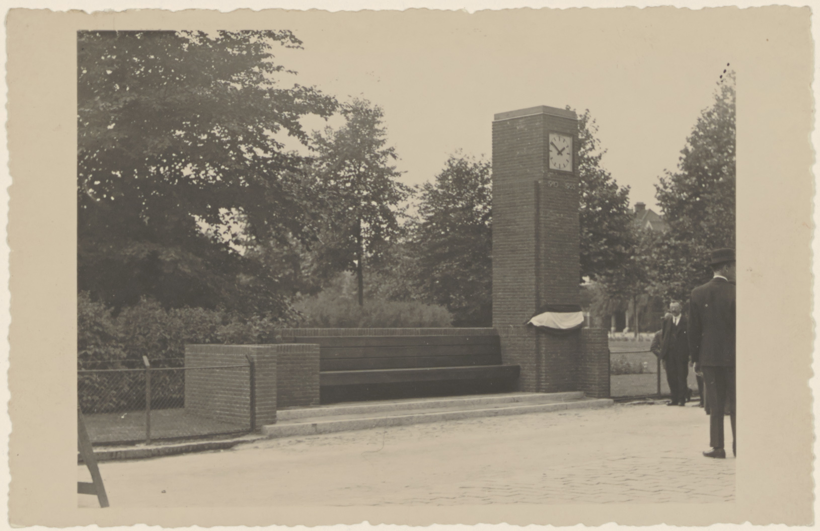 De bank met klok aan de Vrieseweg tegenover de ingang van het park Merwestein. Het bouwsel werd in 1935 bij het 25-jarig bestaan van het G.E.B. door het personeel van dit bedrijf aan het gemeentebestuur aangeboden.