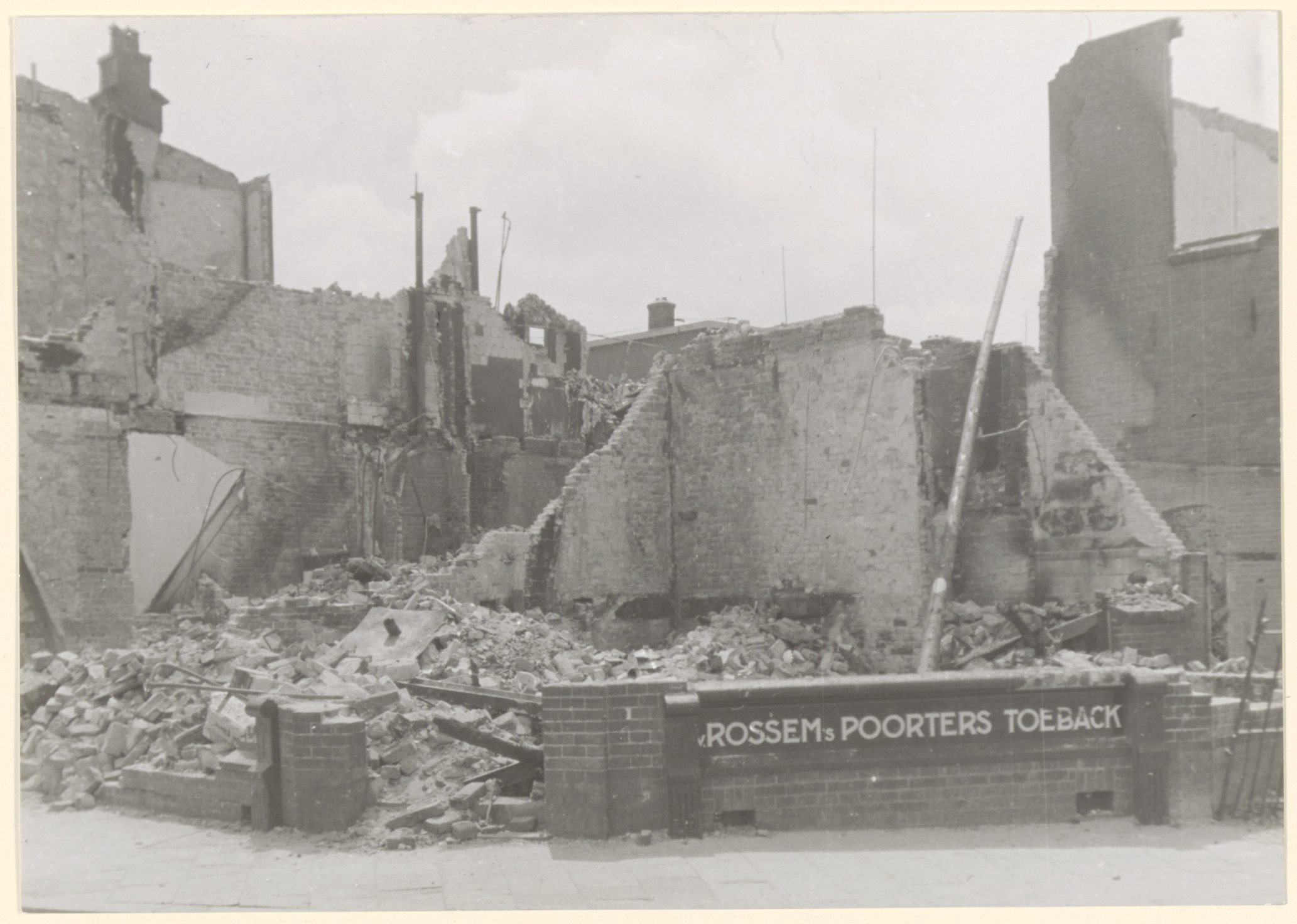 In de Tweede Wereldoorlog door de Duitsers in brand geschoten panden aan de Dubbeldamseweg, hoek Markettenweg.