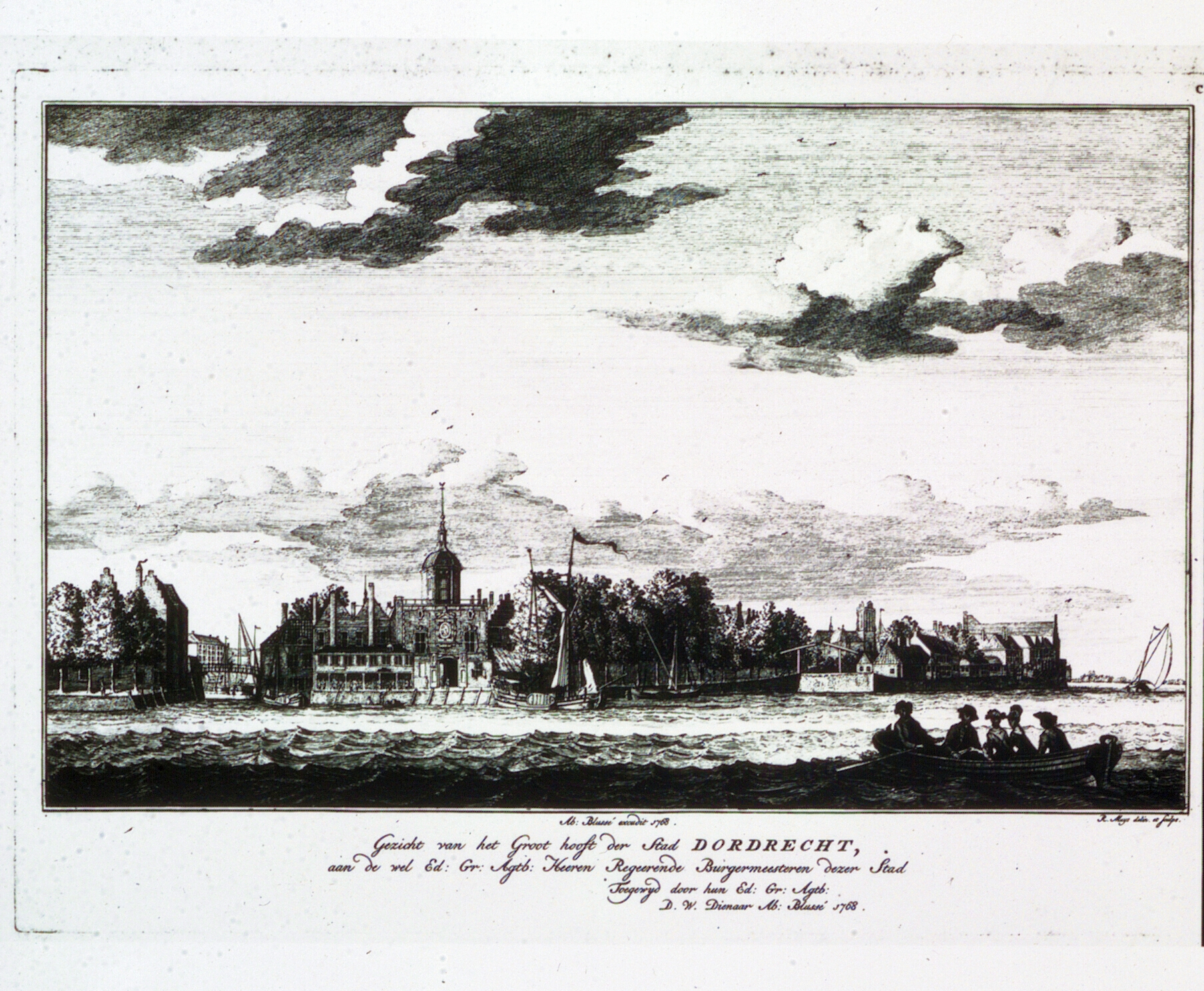 - Gezicht op de stad Dordrecht vanaf de rivier, met nadruk op de Groothoofdspoort, rechts de Damiatebrug en daarachter de Grote Kerk.