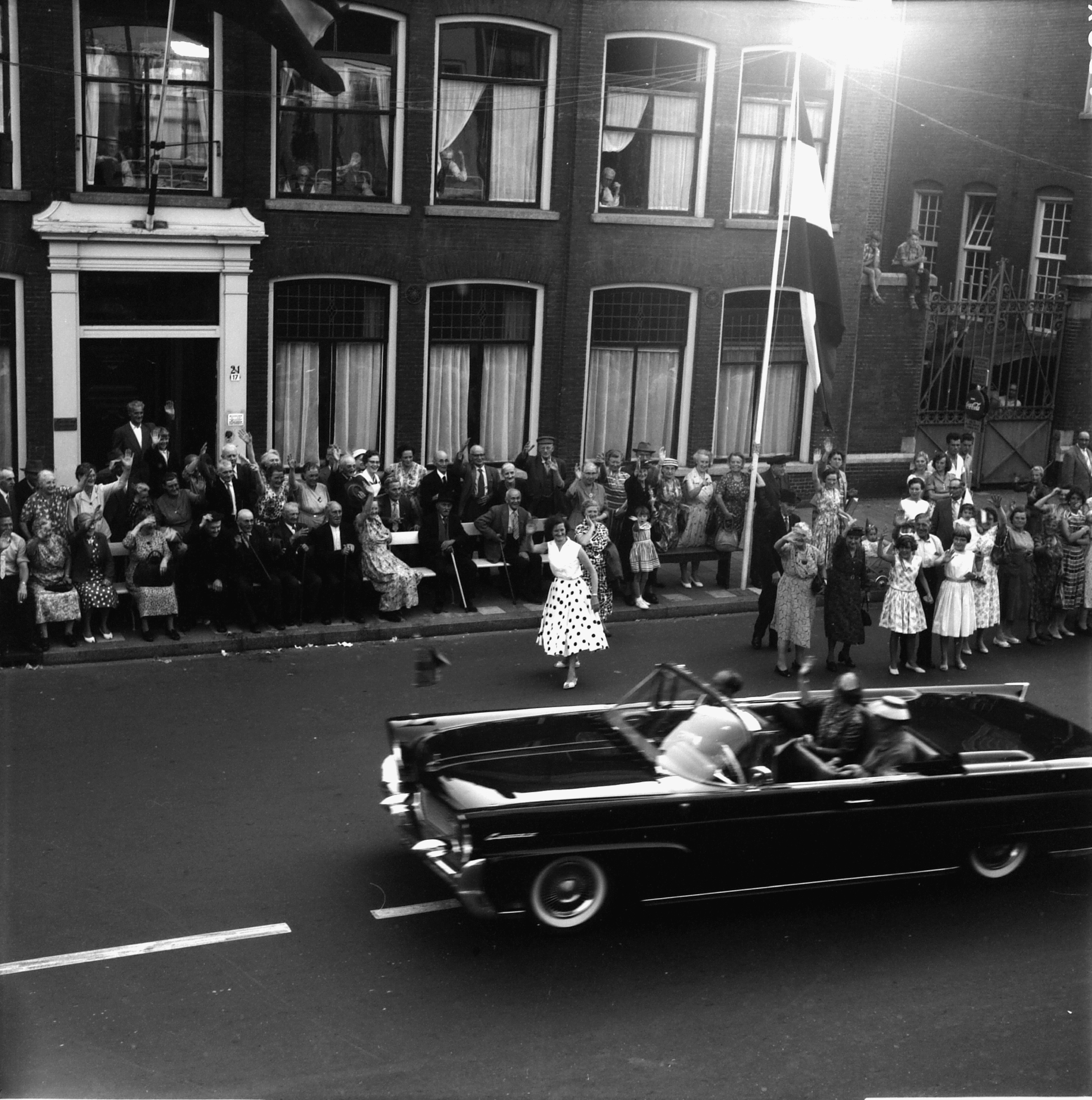 Bagijnhof. In de auto Koningin Juliana en Burgemeester van der Dussen. De toeschouwers …