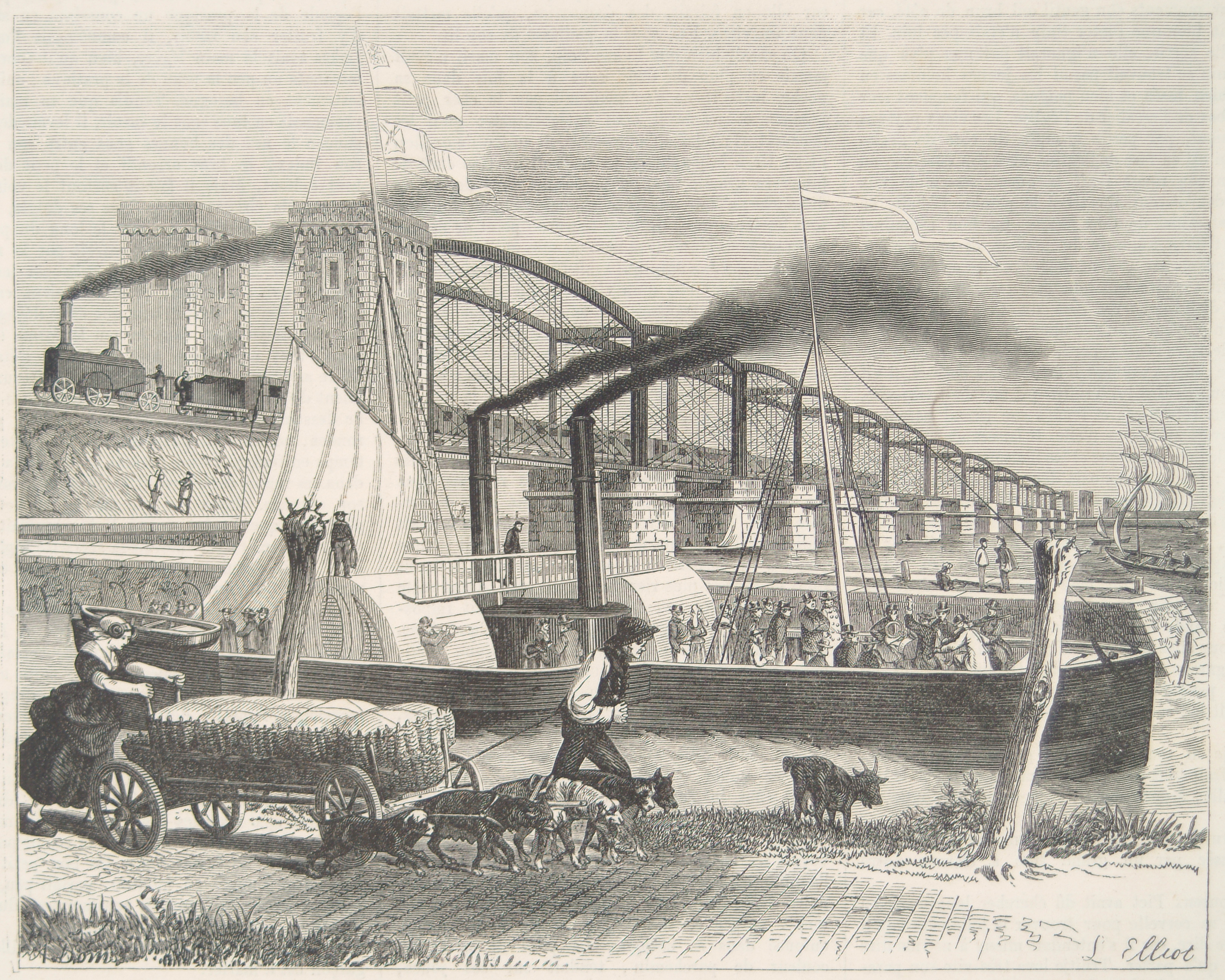 De Moerdijkspoorbrug met trein en een hondenkar en raderboot met spelend orkest op de voorgrond.