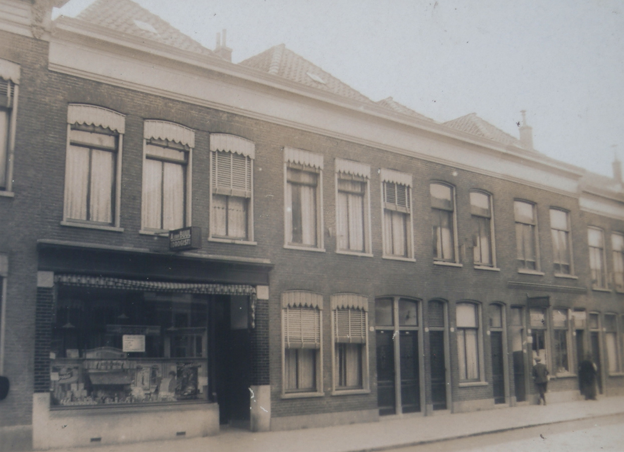 Huizen aan de Spuiweg rond nr. 56; links de drogisterij van A. van Buul