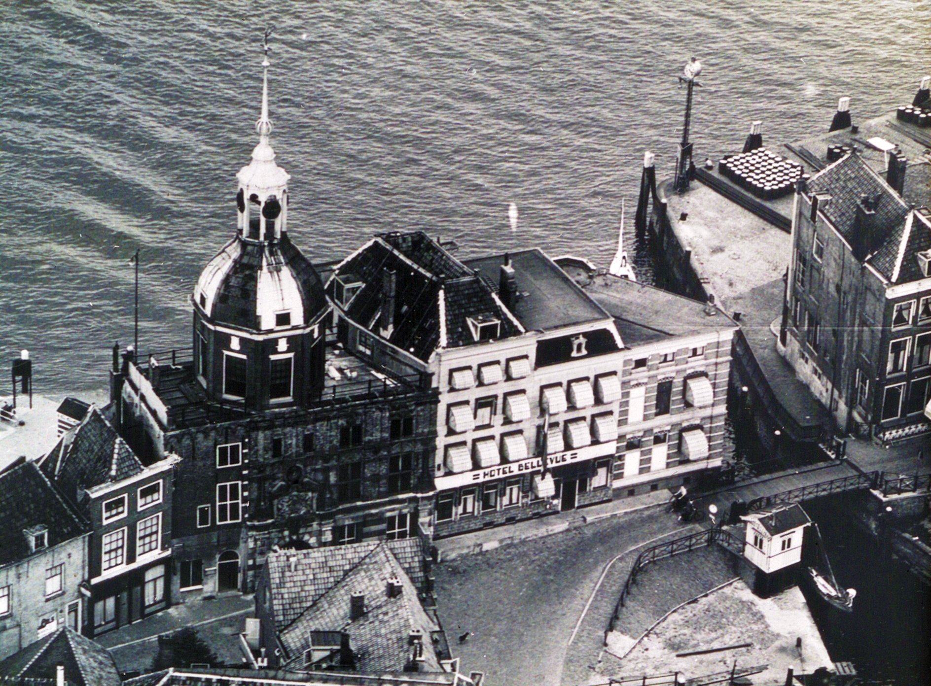 - Gezicht vanuit de lucht op de Groothoofdstoren en Hotel Bellevue, de Palingstraat die overgaat in de Boomstraat en de Boombrug.