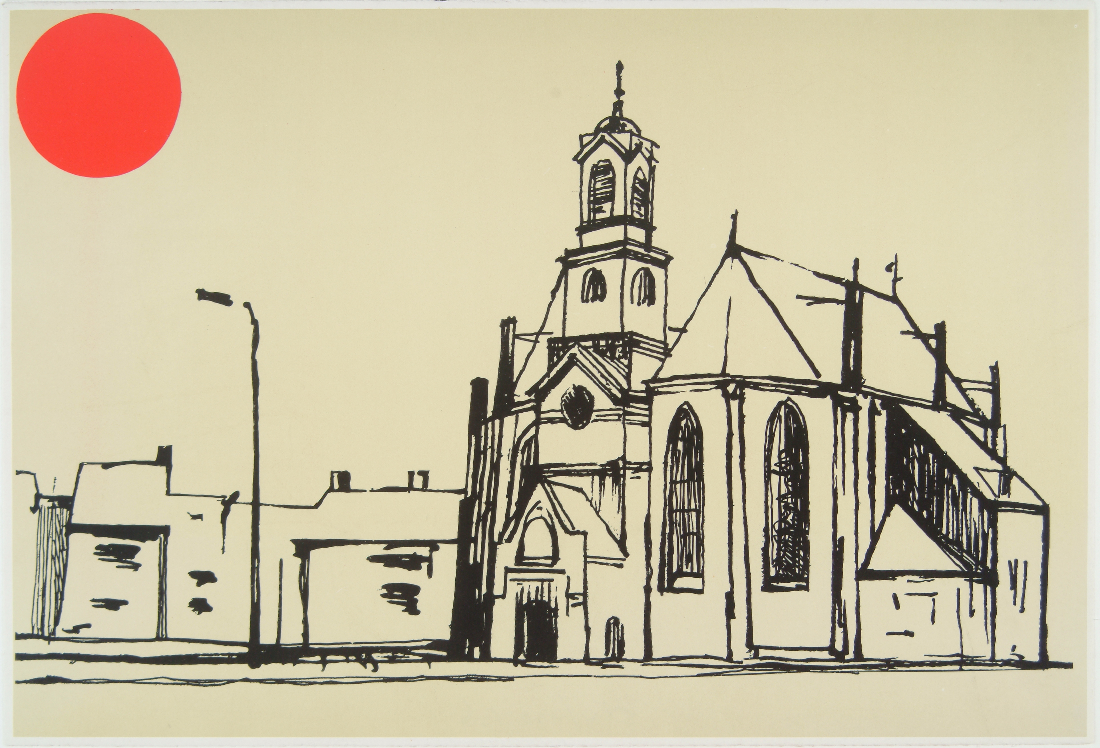 Nieuwkerk aan het Nieuwkerksplein met rode zon.