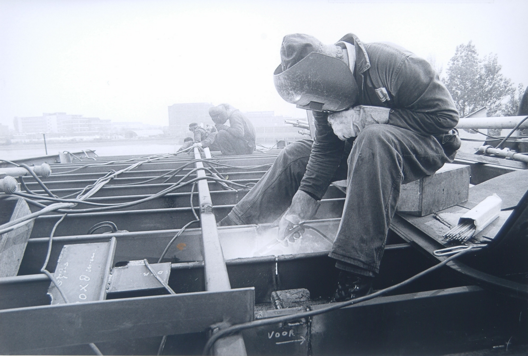 Werkzaamheden op een langshelling van scheepswerf De Biesbosch aan de Merwedestraat