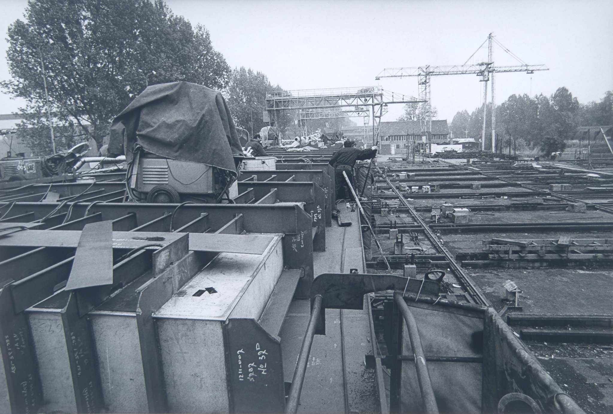 Werkzaamheden op een langshelling van scheepswerf De Biesbosch aan de Merwedestraat