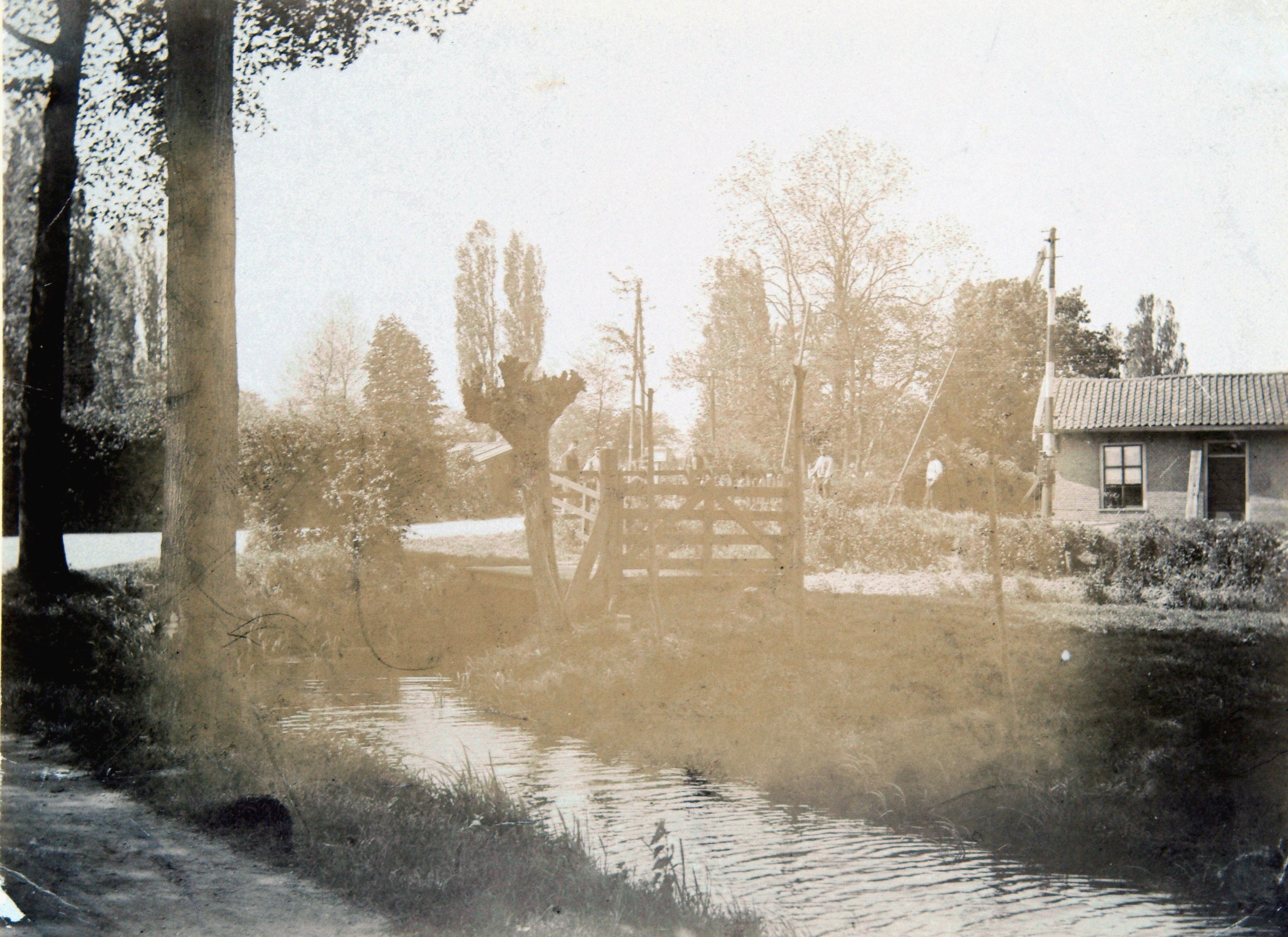 De (niet zichtbare) overweg in de Dubbeldamseweg met seinpaal en spoorwachtershuisje, gezien vanaf de Achterweg (links op de voorgrond) naar het oosten.