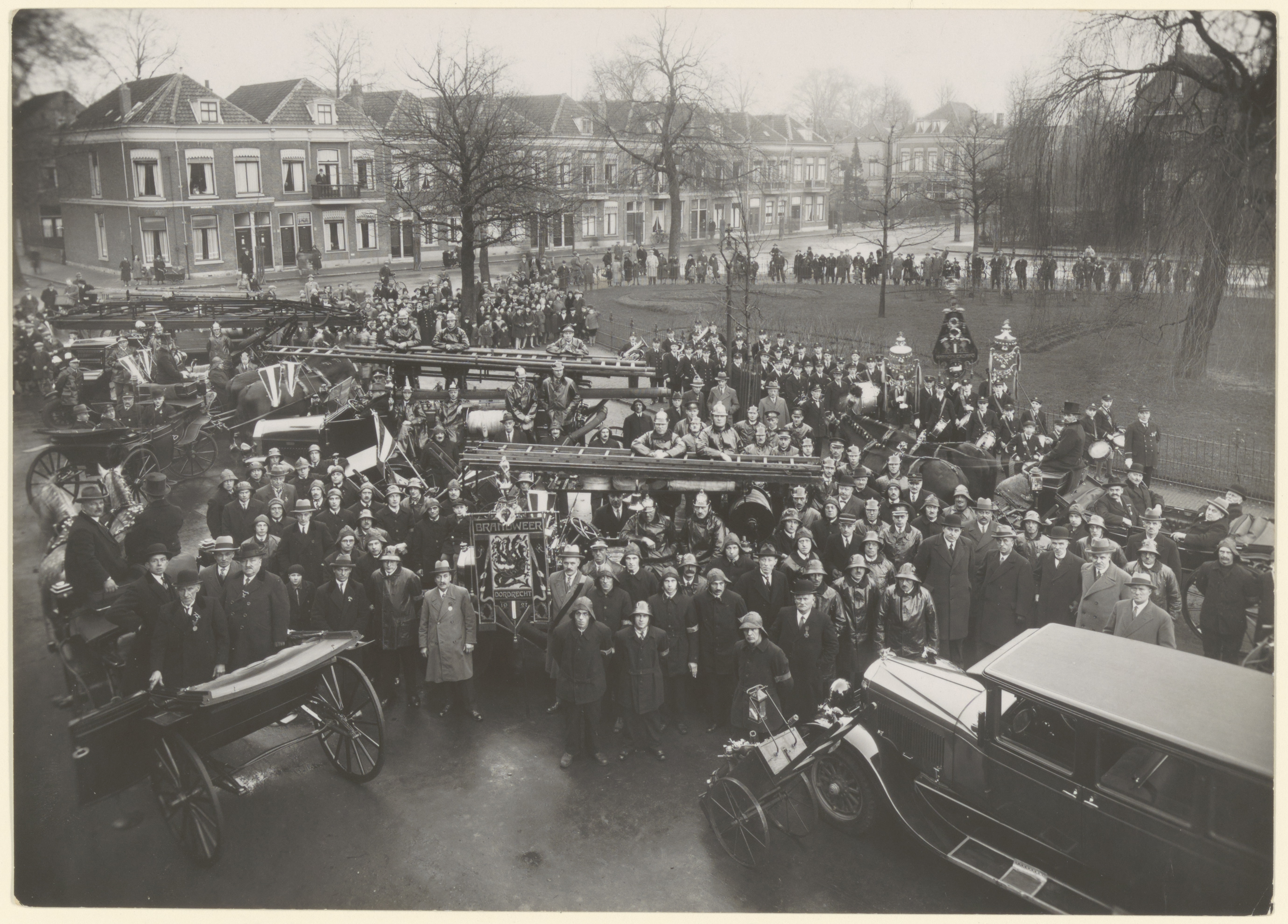 - afscheid brandweer calèches / koetsen / rijtuigen groepsportretten oldtimers vaandels