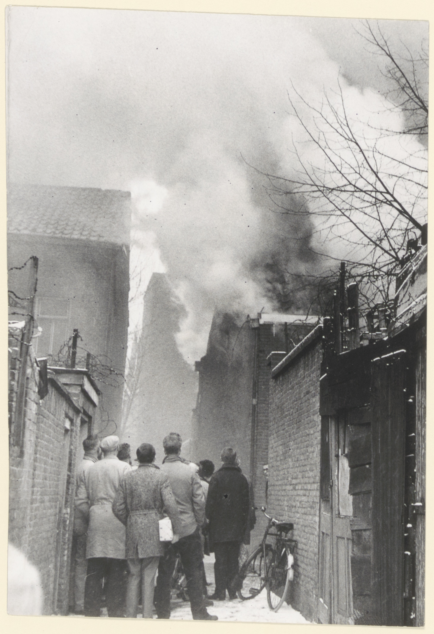 Een felle brand in het pand van Interland Techniek NV in de Nieuwstraat, hoek Dwarsgang, gezien vanuit de Dwarsgang.