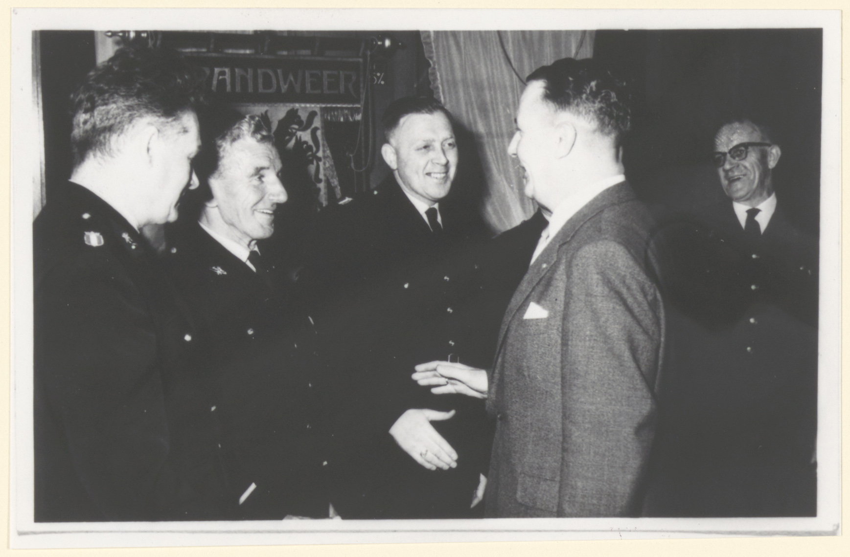 - Brandweercommandant H. Muller biedt gelukwensen aan, aan het bestuur van de Dordtse Brandweer Vereniging bij de viering van het 35-jarig bestaan op 13 januari 1962.V.l.n.r. M. v. Wouwe, W. Versluis, A.C.A. v. Gool, H. Muller en D. 't Jong.