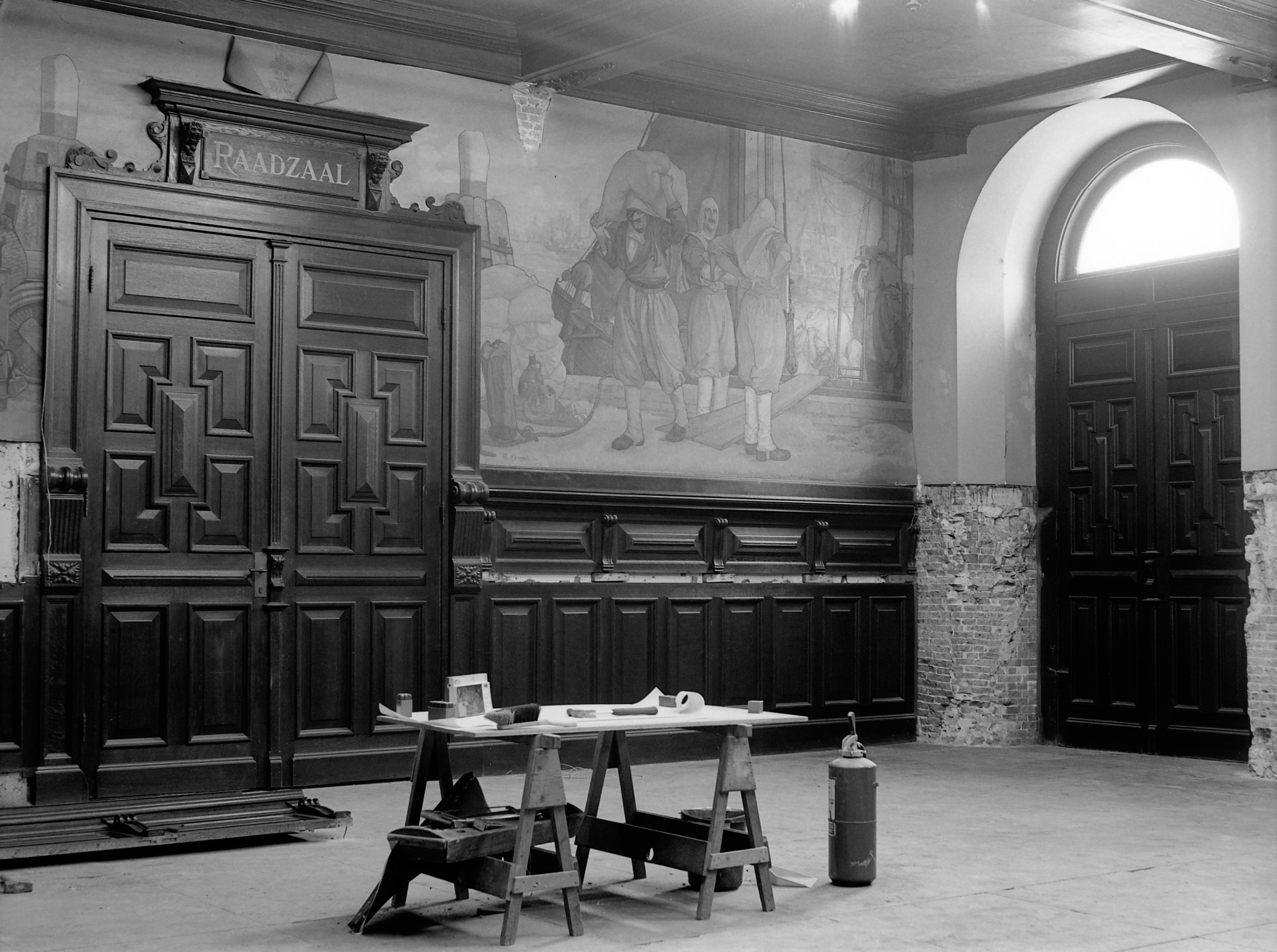 Werkzaamheden in de hal van het Stadhuis met de deur naar de Raadzaal