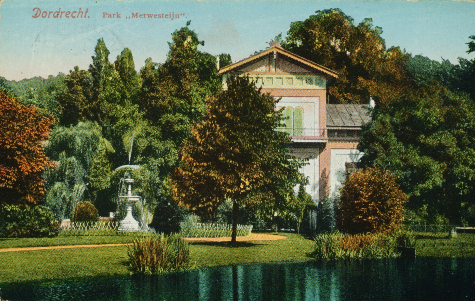 Vijver met fontein nabij villa Merwestein in Park Merwestein.