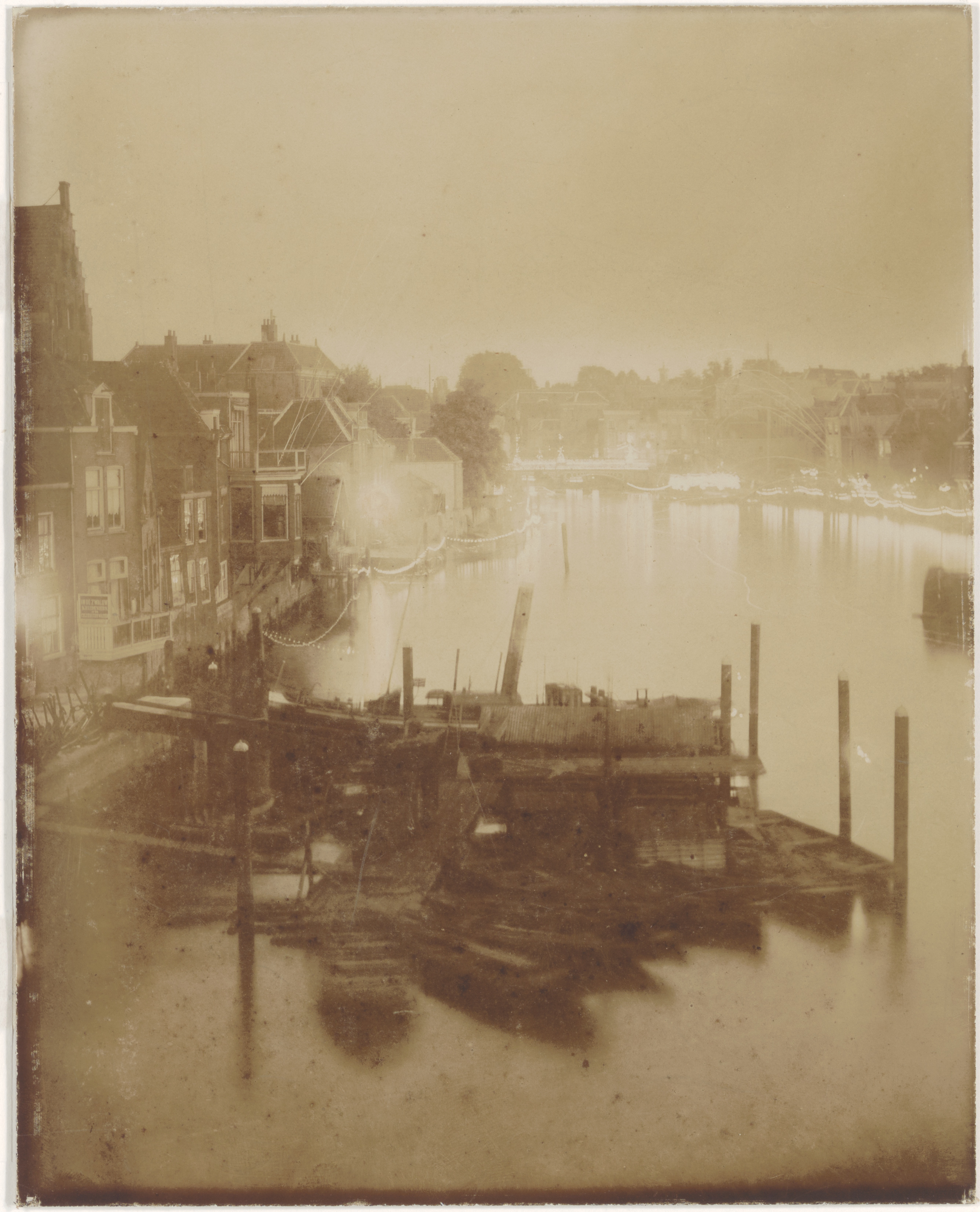 - Feestverlichting in de Wijnhaven tussen Boombrug en Nieuwbrug (achtergrond). Links de Voorstraat, rechts de Wijnstraat.