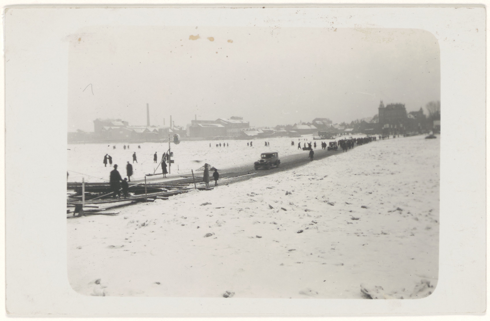 - Oldtimers en voetgangers op de dichtgevroren Oude Maas op de plek waar normaal de veerboot vaart.