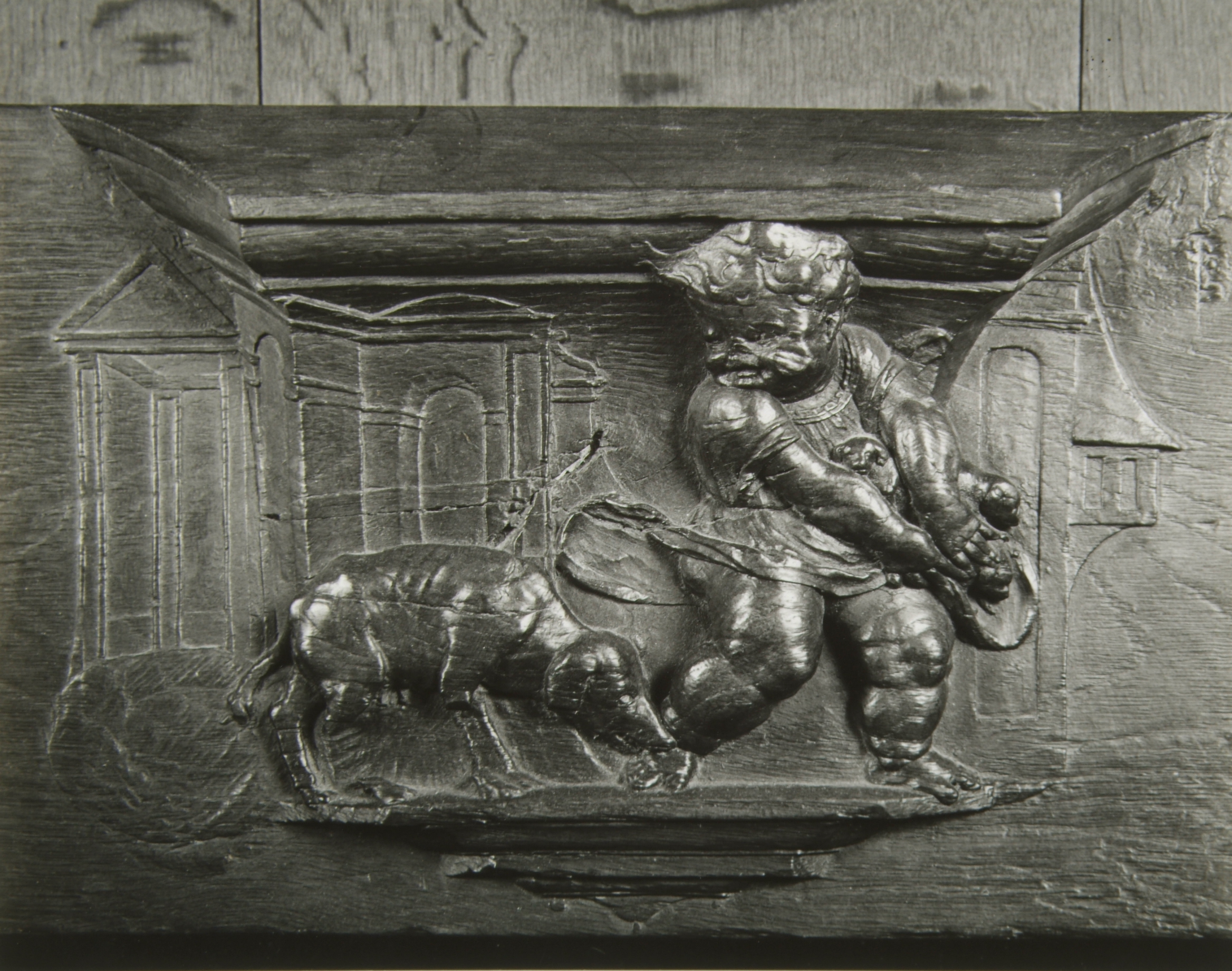 - Detailopname van houtsnijwerk van de misericordias van de koorbanken in de Grote Kerk.