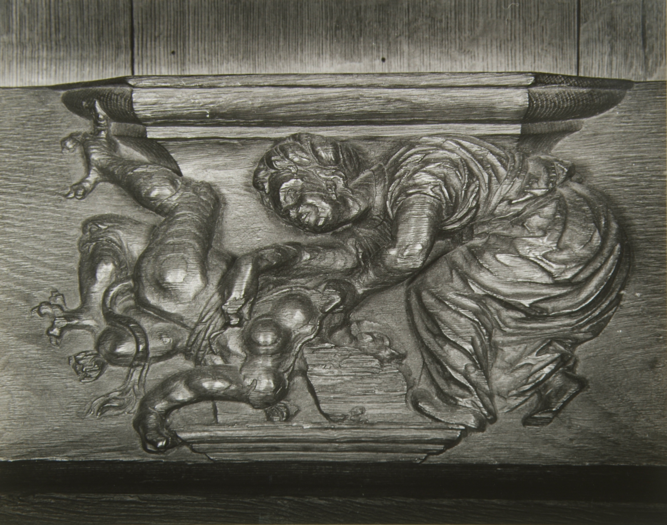 Detailopname van houtsnijwerk van de misericordias van de koorbanken in de Grote Kerk.