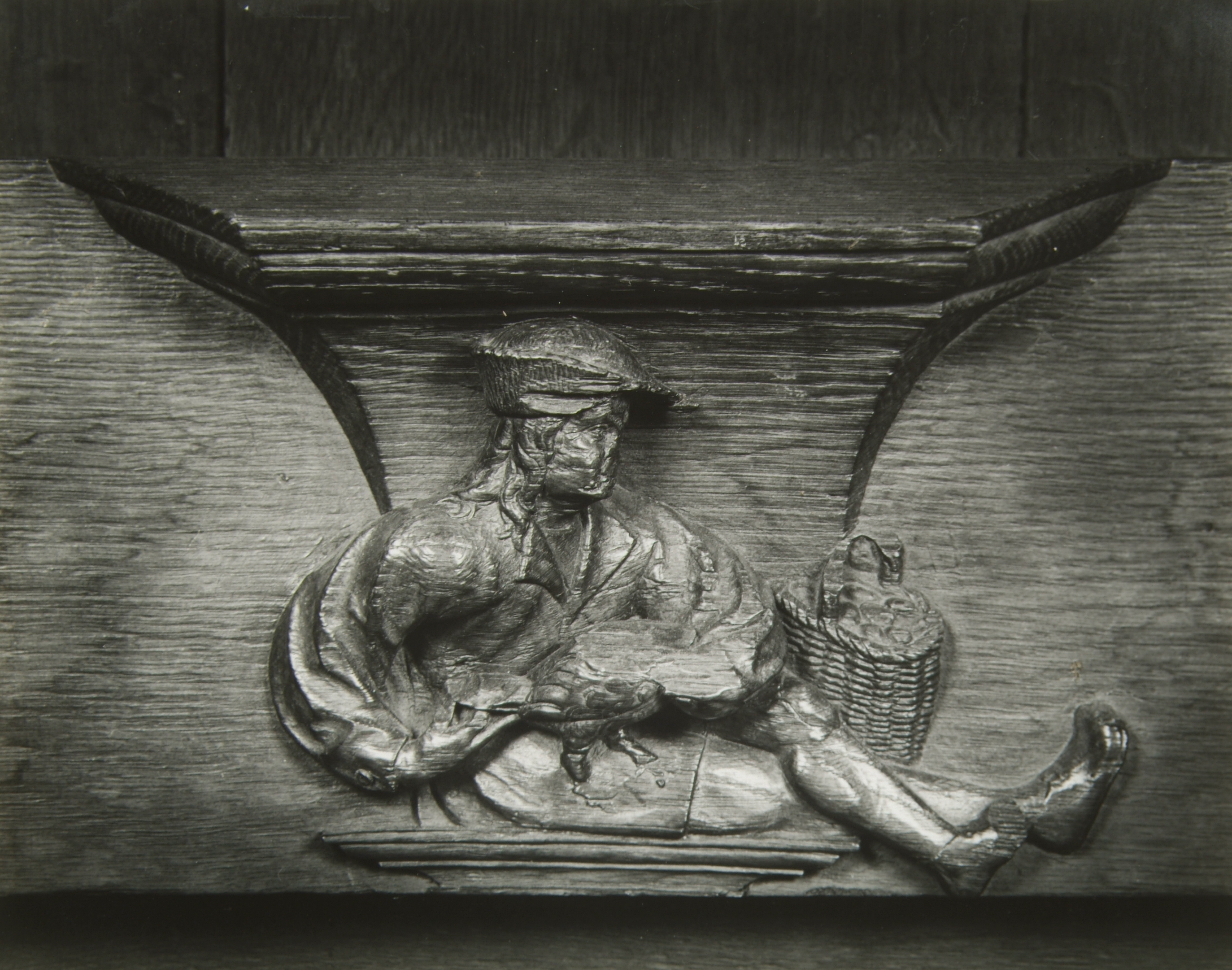 - Detailopname van houtsnijwerk van de misericordias van de koorbanken in de Grote Kerk.