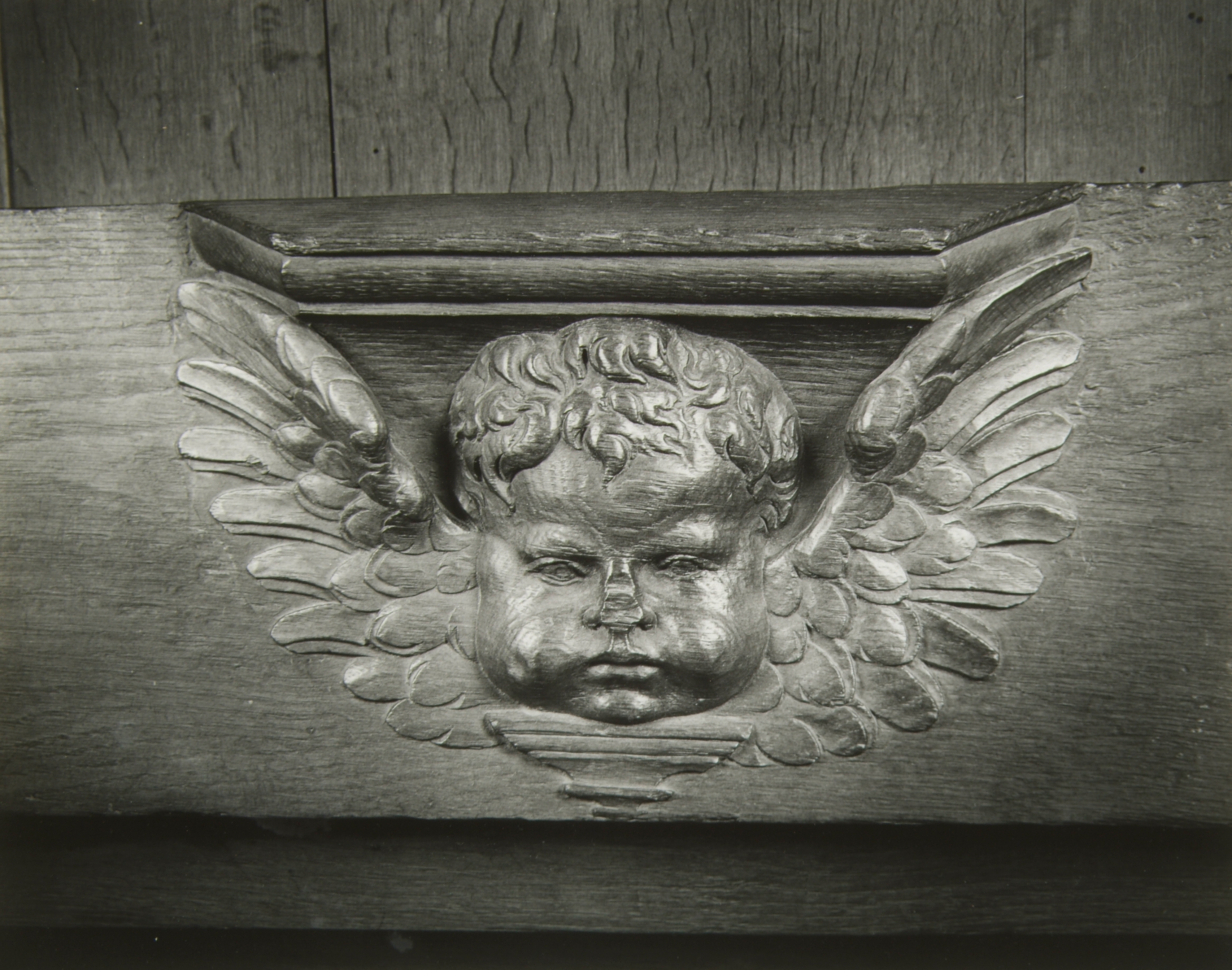 - Detailopname van houtsnijwerk van de misericordias van de koorbanken in de Grote Kerk.