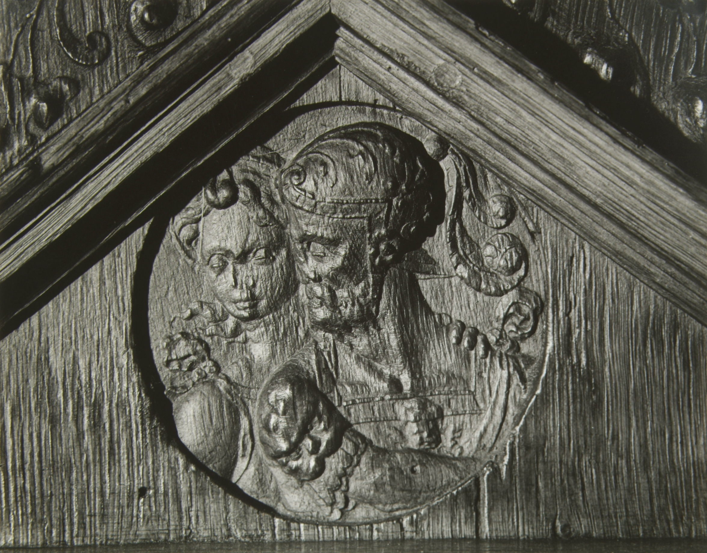 Opname van houtsnijwerk als boogvulling van de zijkanten van de koorbanken in de Grote Kerk.