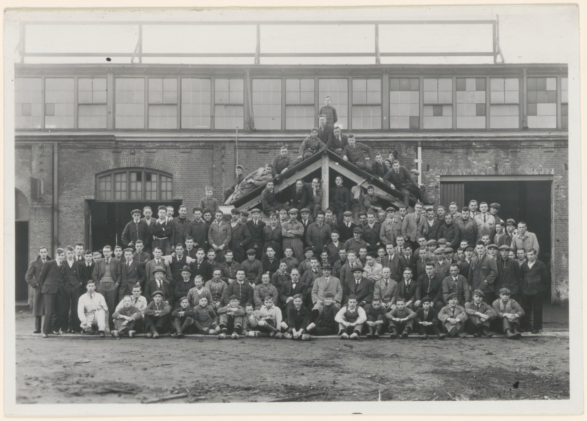 - Groep leerlingen bij het afscheid van P. de Graaff als algemeen leider van de centrale werkplaats in de voormalige brandkastenfabriek aan de Spuiweg.