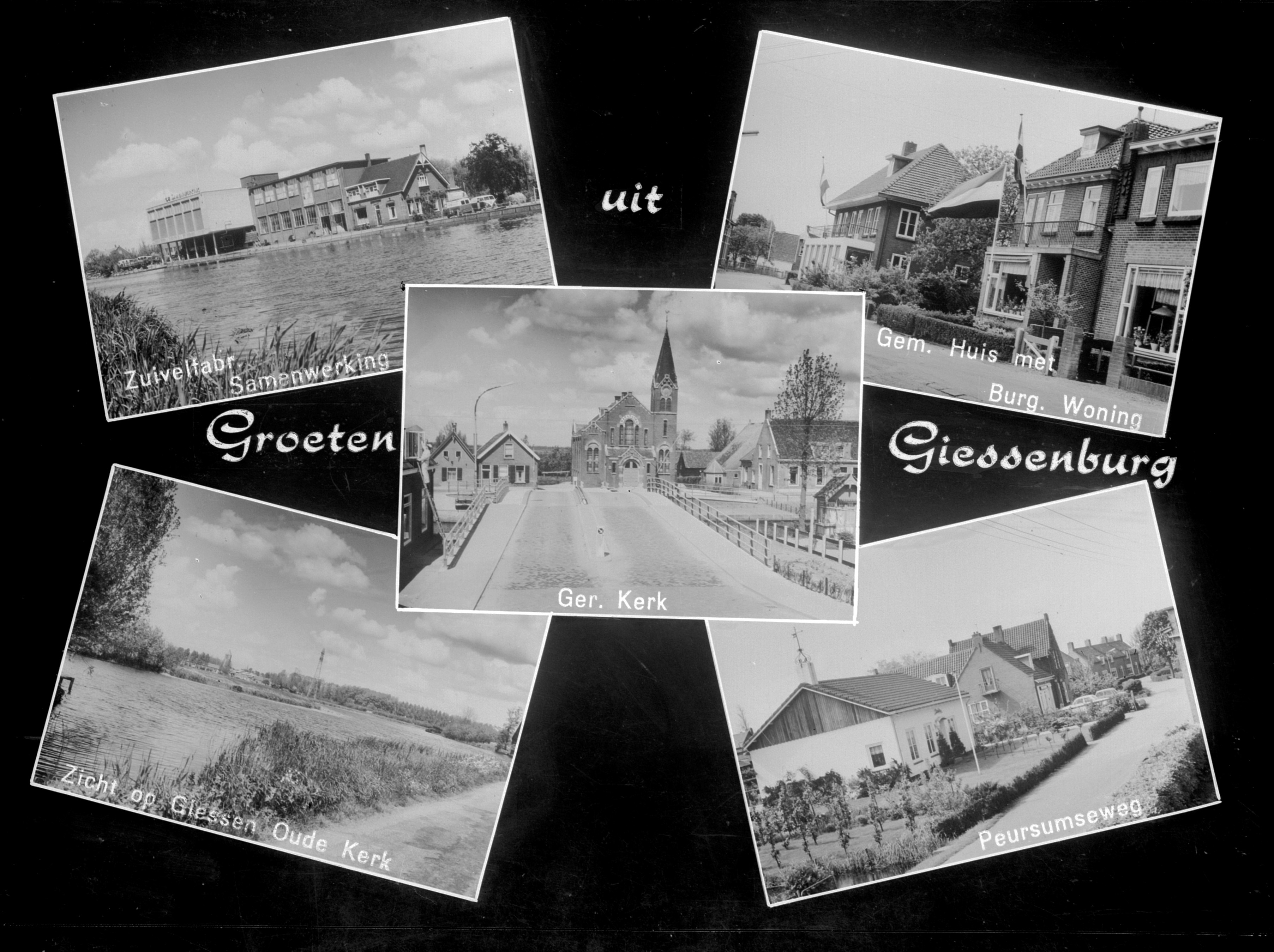 - Giessenburg, 'groeten uit...' prentkaart. Afbeelding van zuivelfabriek samenwerking, Gereformeerde kerk, zicht op Giessen-Oudkerk, Gemeentehuis met burgemeesterswoning, Peursumseweg.
