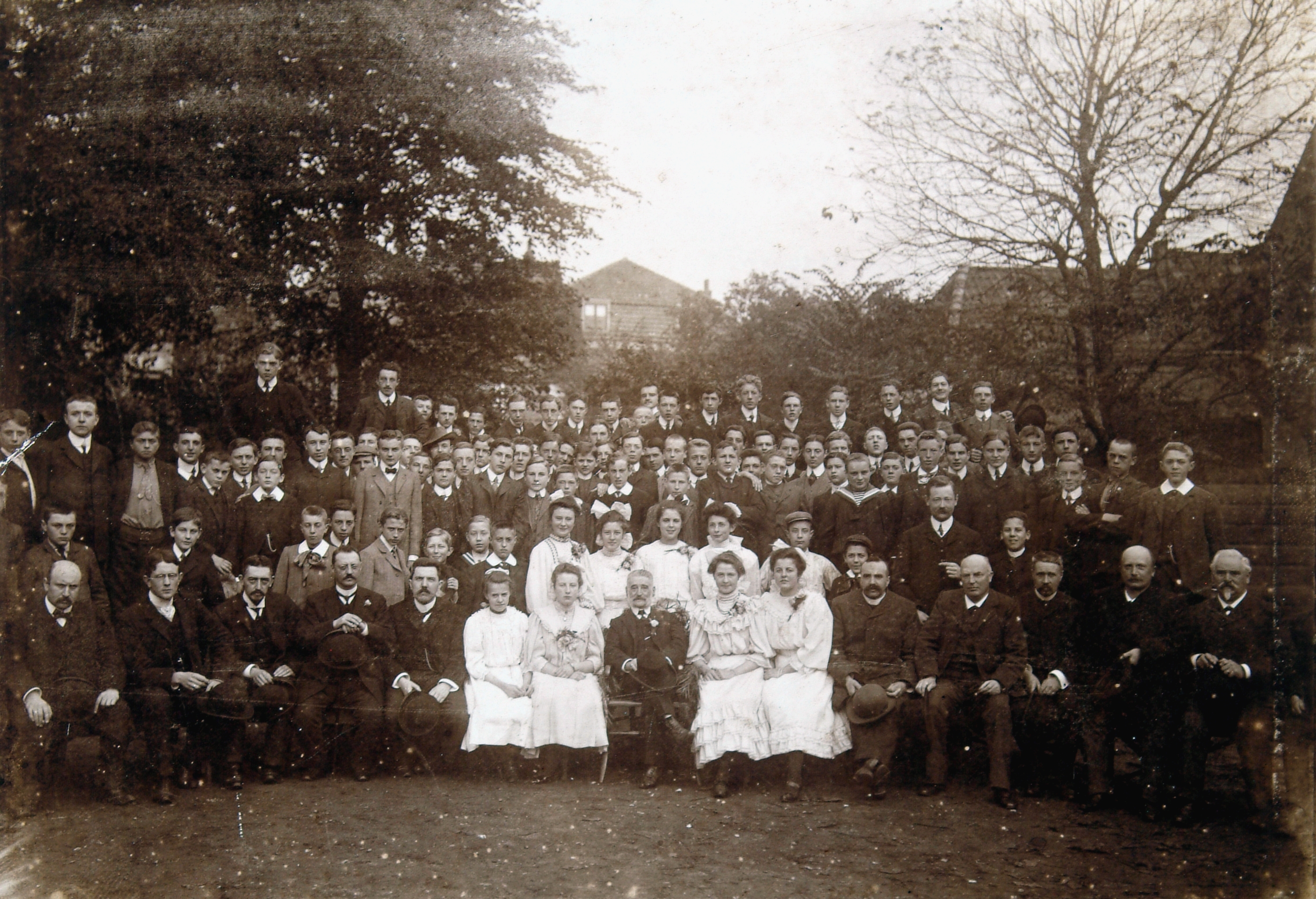- Groepsportret van leraren en leerlingen in de tuin van de HBS aan de Nieuwstraat t.g.v. de 70-ste verjaardag van directeur dr. A.S. van Oven.