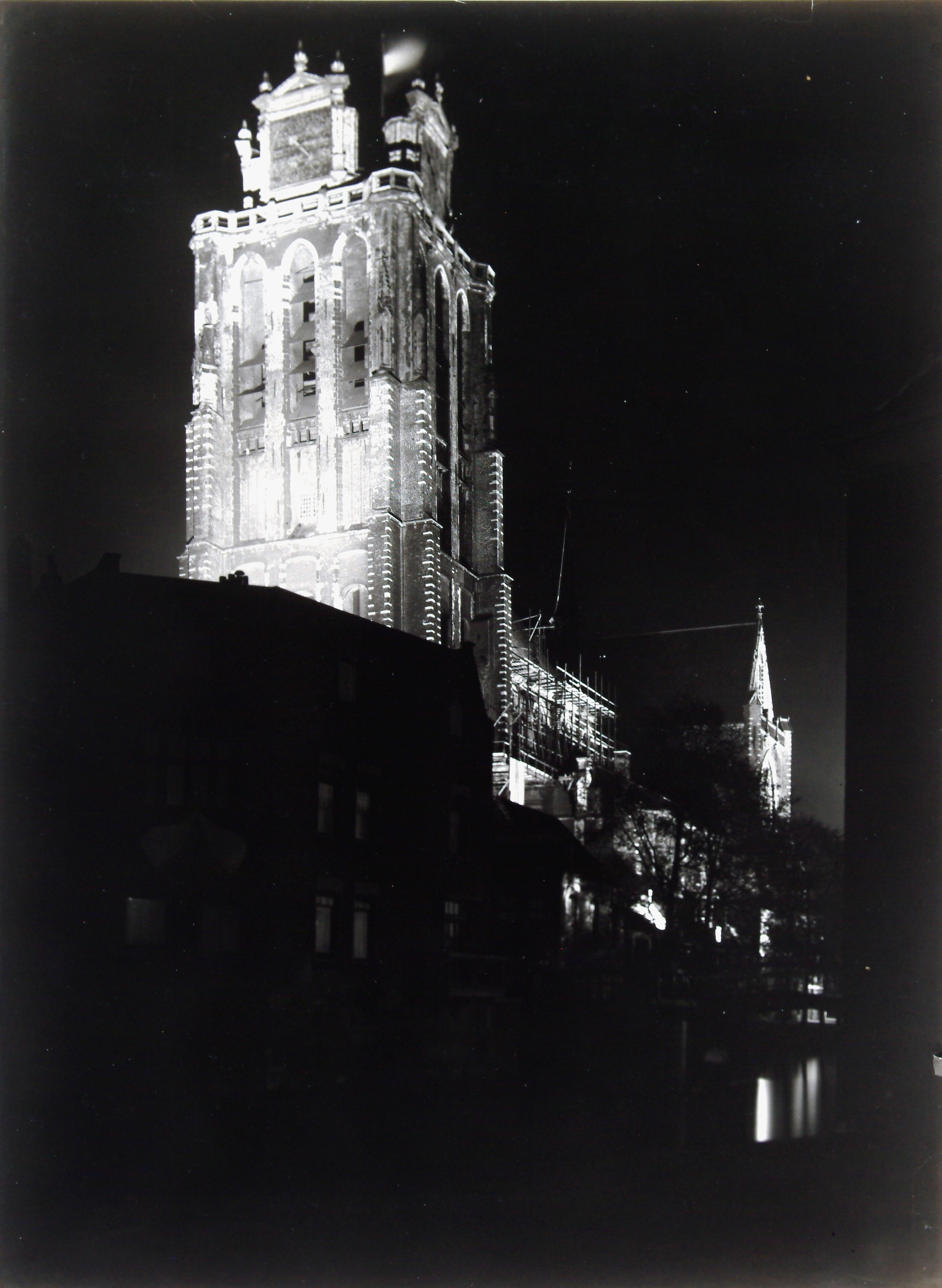 - De verlichte Grote Kerk aan de zijde van de Pottenkade gezien.
