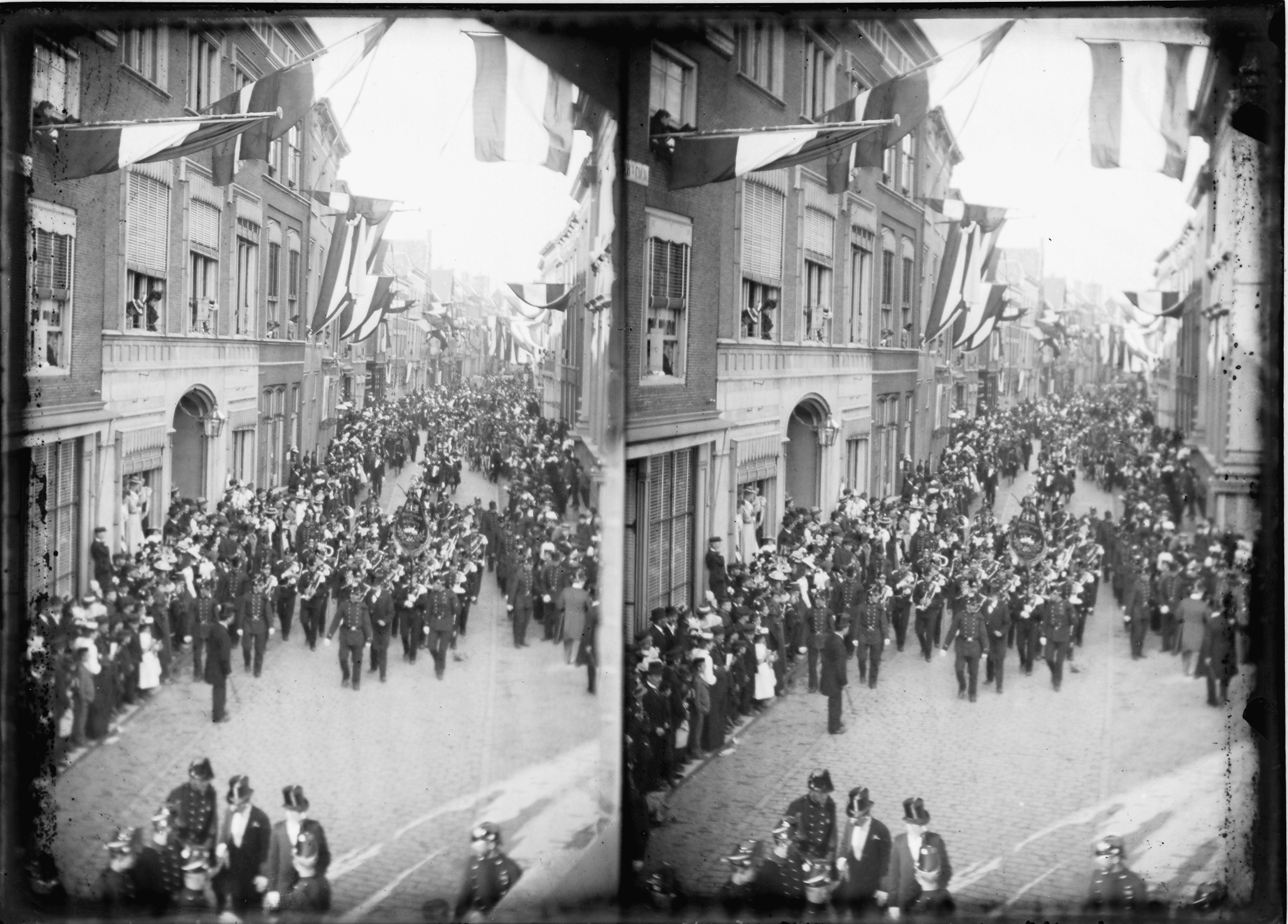Stereofoto van het muziekkorps van de schutterij in Grotekerksbuurt ter hoogte van het …